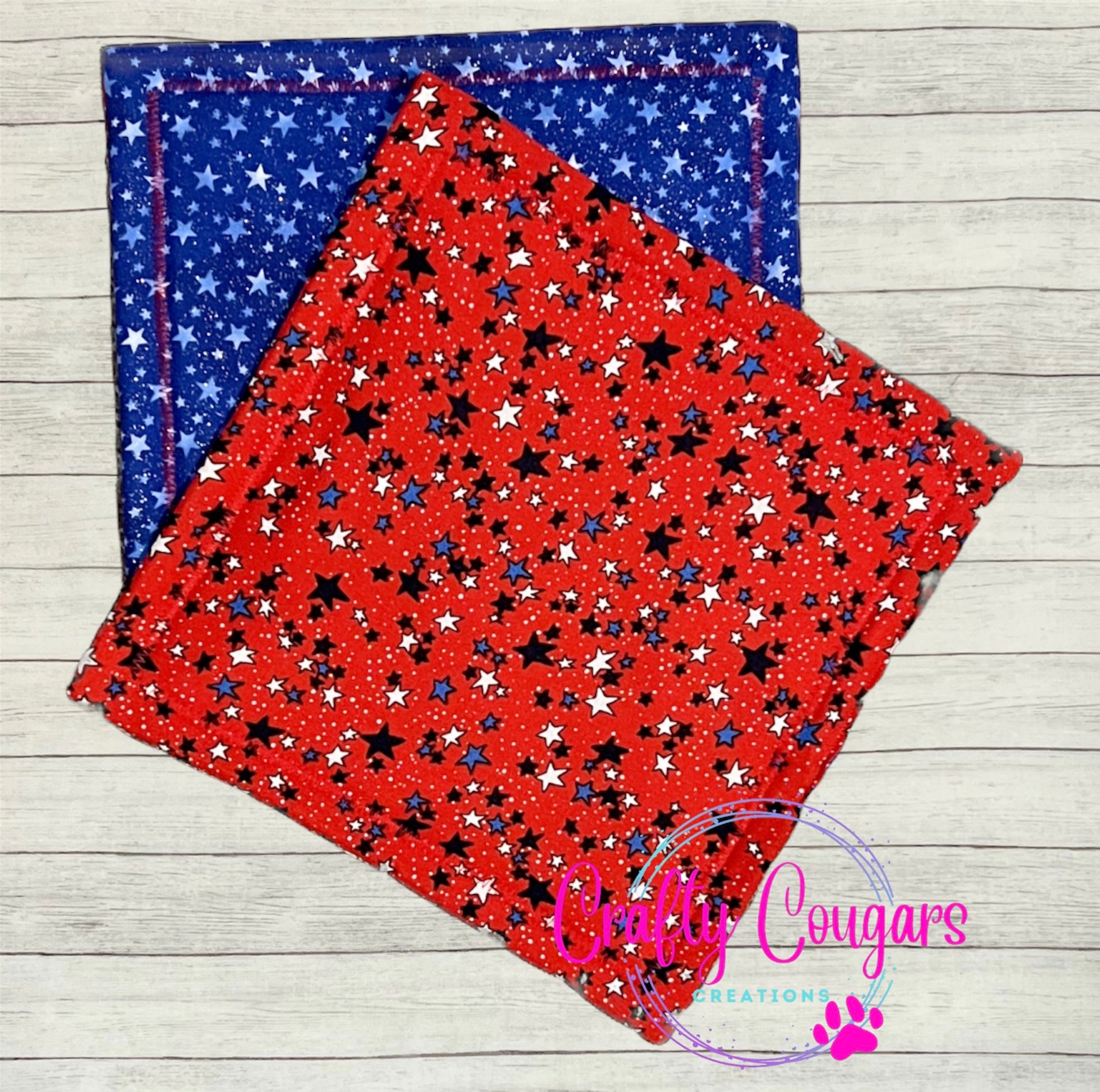 This pot holder is perfect for all of your patriotic holiday parties! It features red and blue stars on one side and a coordinating glittery blur starry fabric on the back. You will find these very useful for protecting your countertops from heat. They are made with coordinating cotton fabrics on the front and back and 2 layers of insulated batting on the inside for heat resistance. These are sold as individual pot holders, not as a set. Each pot holder measures approximately 9 inches by 9 inches.