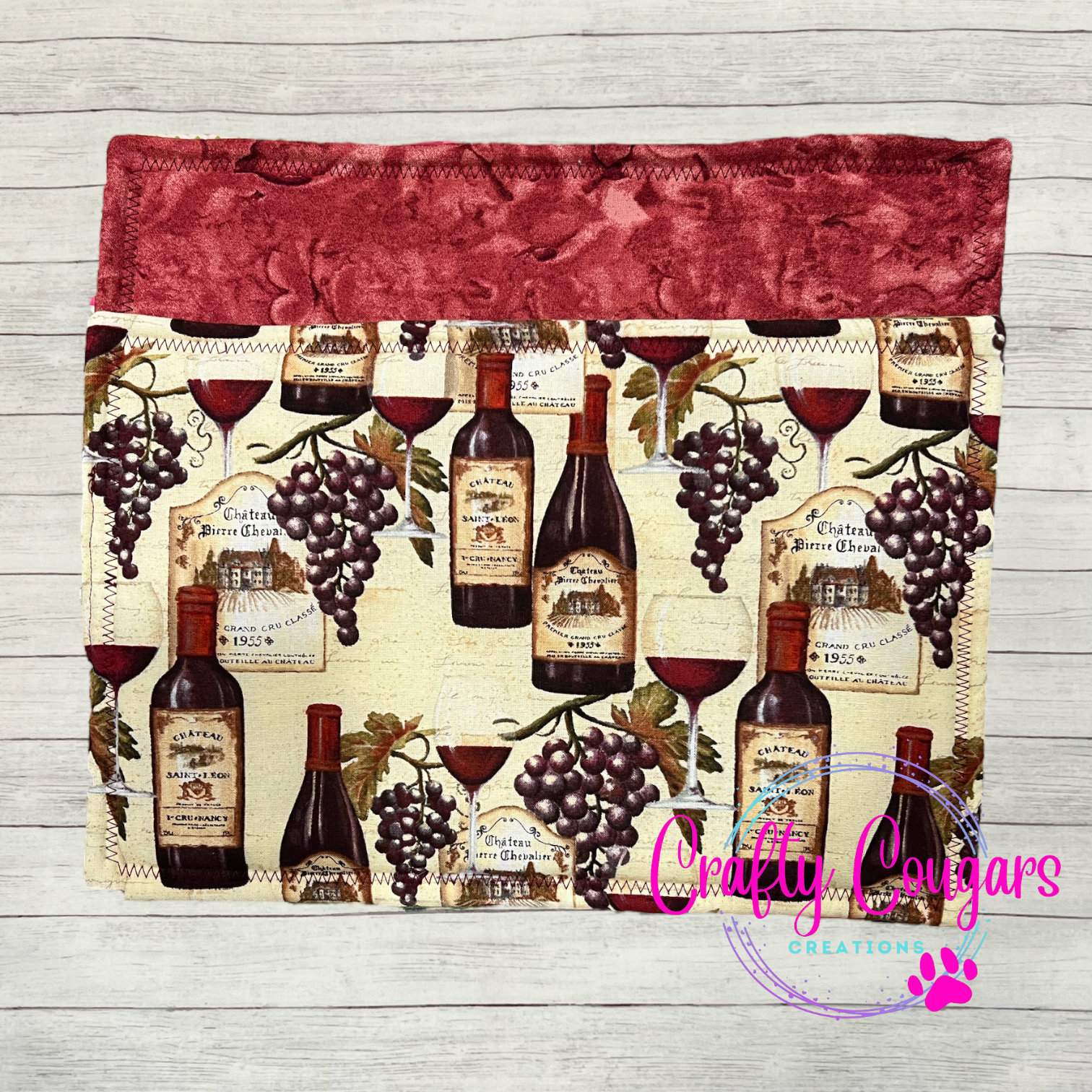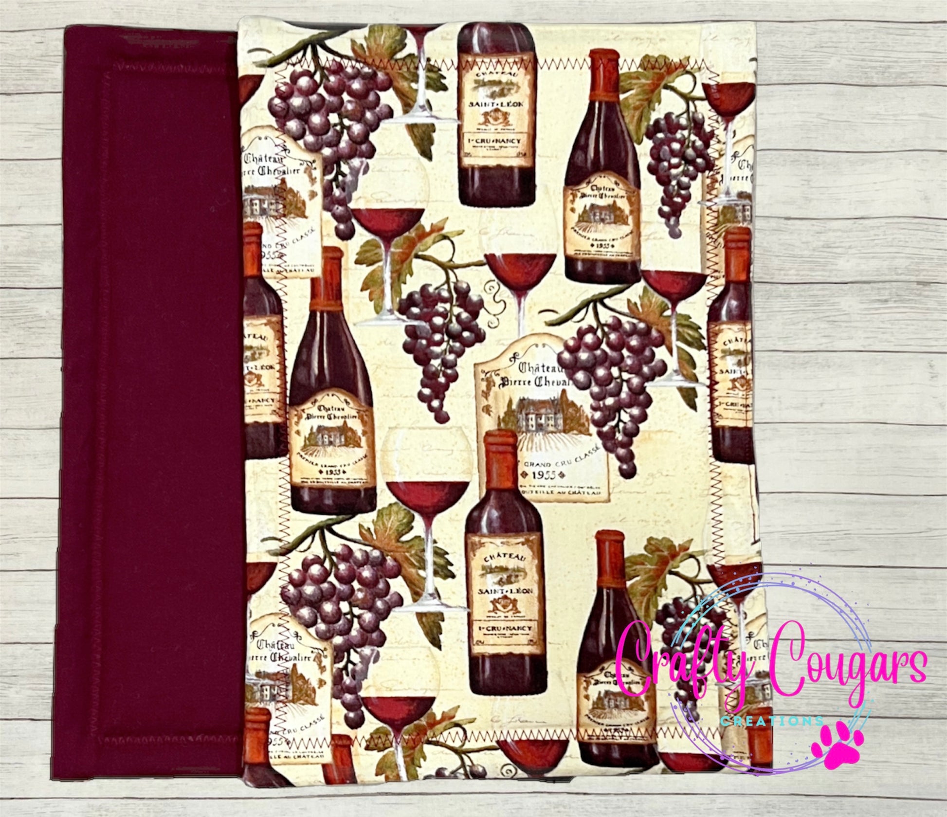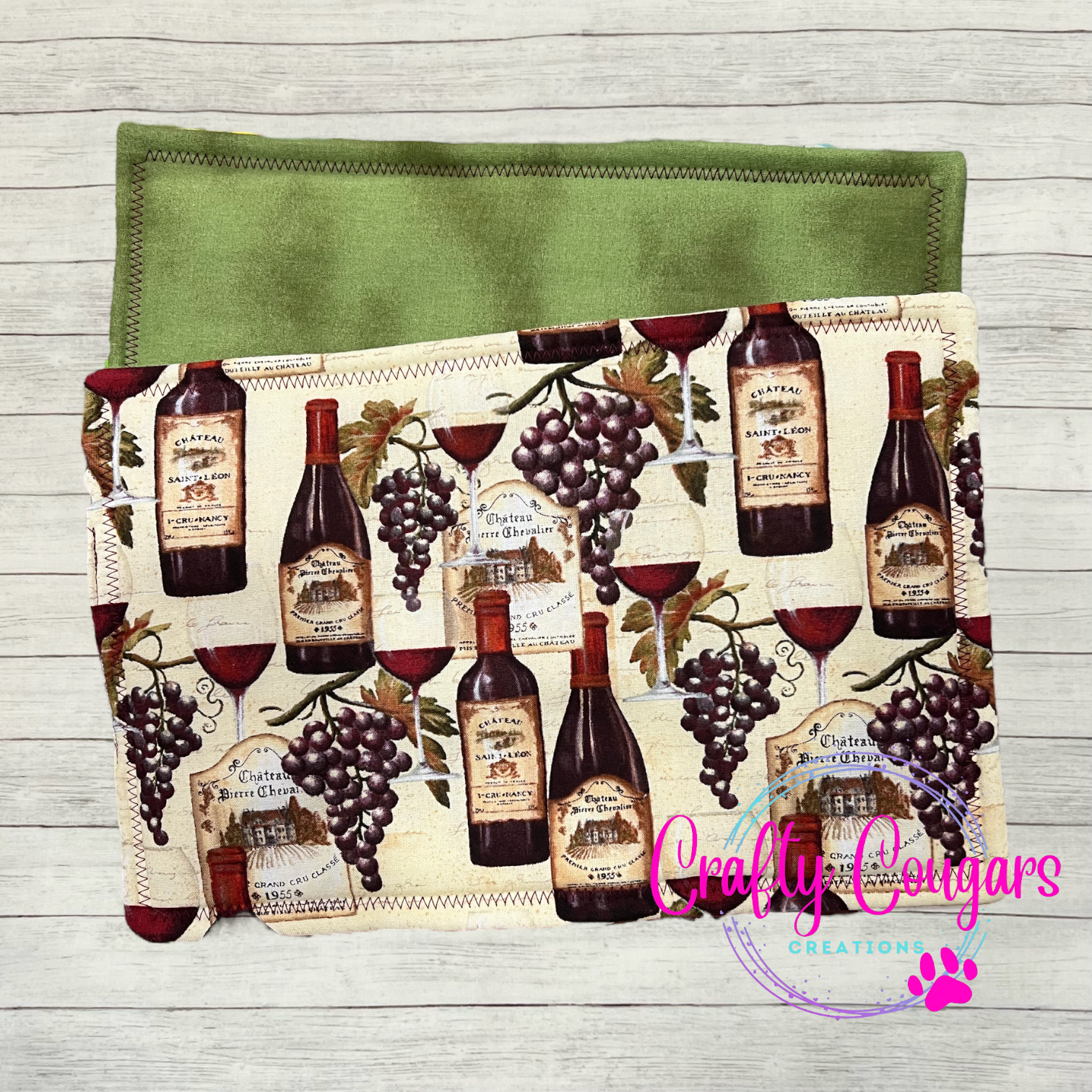 This casserole-sized pot holder features wine and grapes on one side with a coordinating white with black polka dots fabric on the other side.
