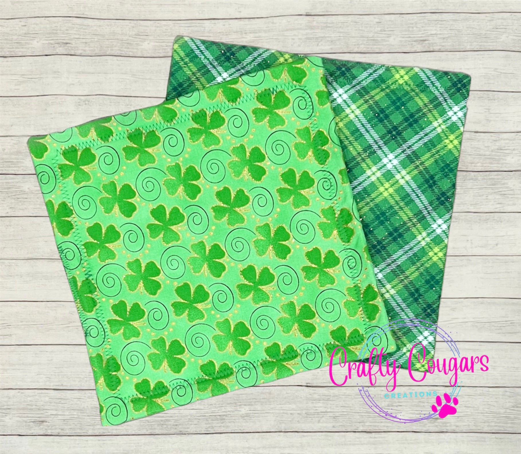 This standard-sized pot holder features bright green shamrocks outlined in glitter with green swirls on one side and a coordinating fabric on the other side. You will find these very useful for protecting your countertops from heat. They are made with coordinating cotton fabrics on the front and back and 2 layers of insulated batting on the inside for heat resistance. These are sold as individual pot holders, not as a set. Each pot holder measures approximately 9 inches by 9 inches.