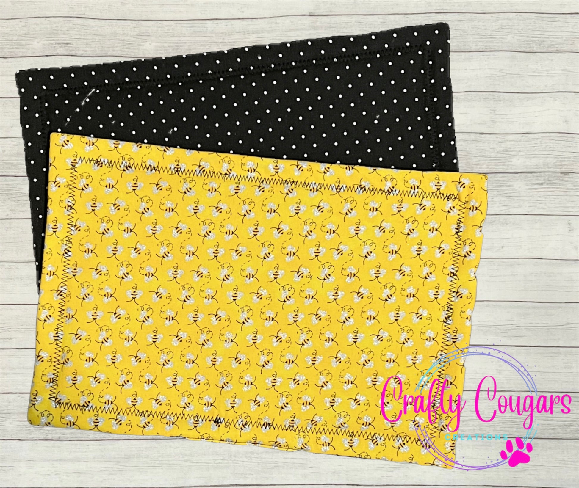 This casserole-sized pot holder features glittery bees on one side with a coordinating black & white polka dotted fabric on the opposite side.