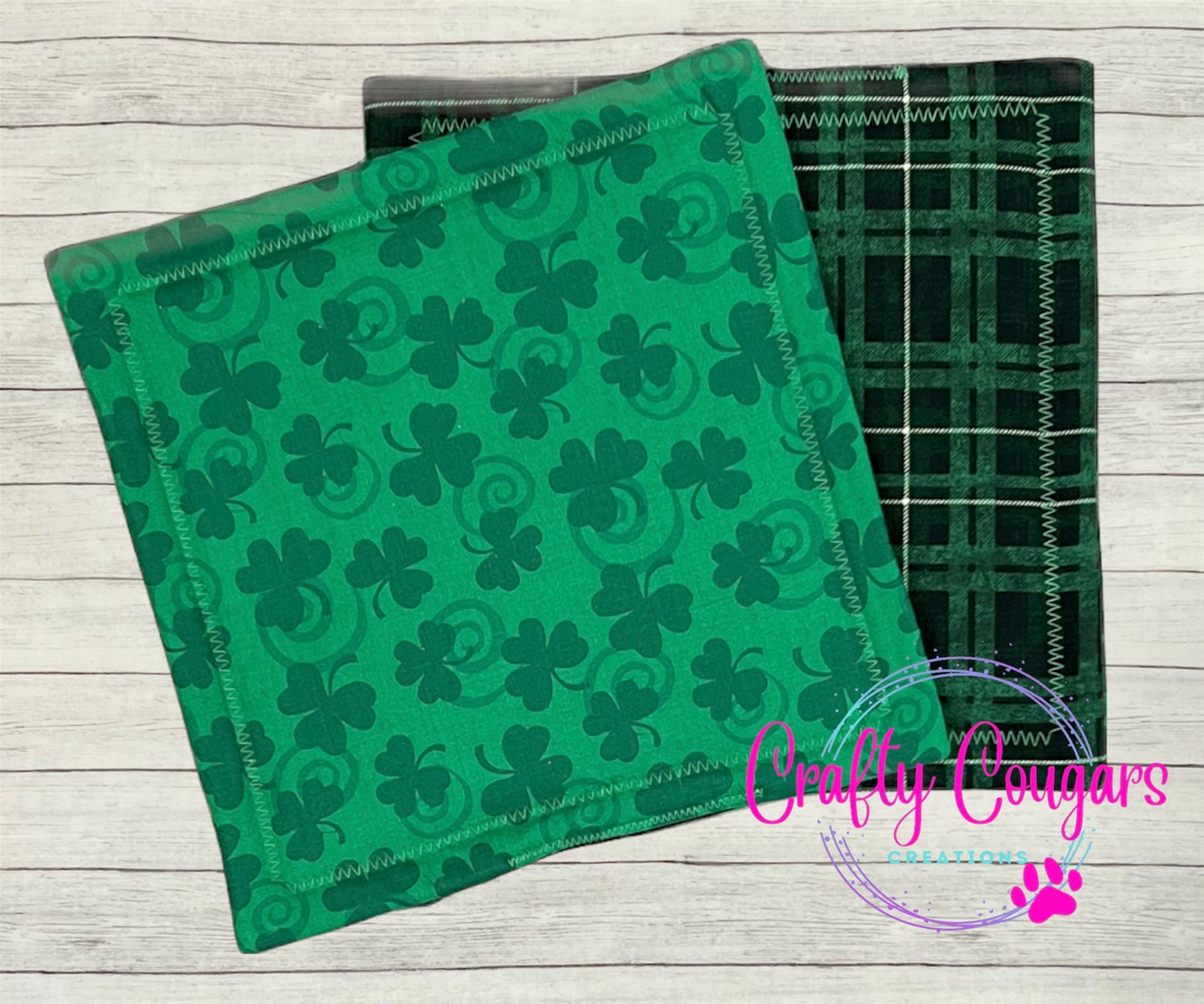 This standard-sized pot holder features dark green shamrocks and swirls on one side and a coordinating fabric on the other side. You will find these very useful for protecting your countertops from heat. They are made with coordinating cotton fabrics on the front and back and 2 layers of insulated batting on the inside for heat resistance. These are sold as individual pot holders, not as a set. Each pot holder measures approximately 9 inches by 9 inches.
