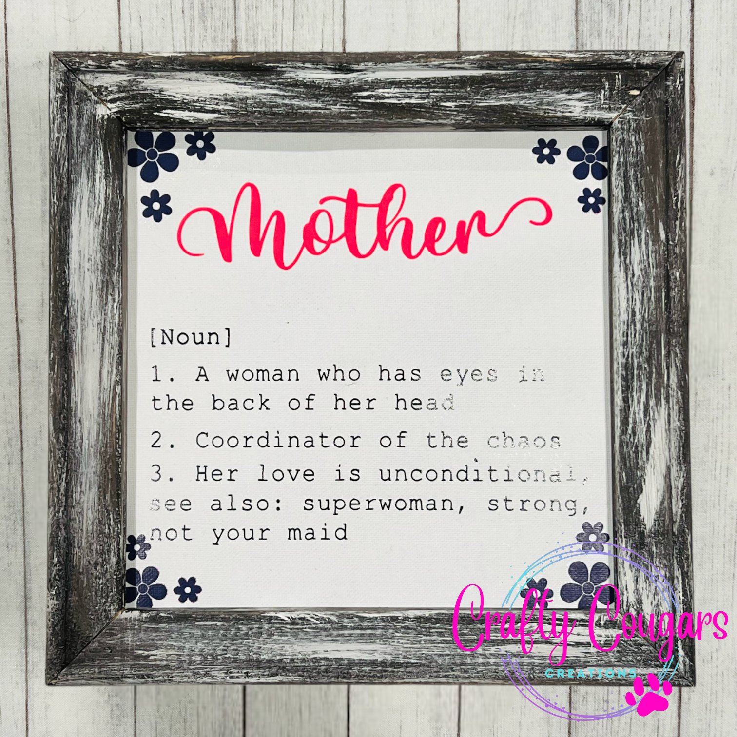 This adorable canvas sign features “Mother” in neon pink vinyl with the definition in black vinyl. The floral border around the sign is done in metallic purple vinyl. We use heat transfer vinyl and a commercial heat press to ensure the images do not peel off. The frame is stained and hand-painted to give it a distressed look. This frame is 10 inches by 10 inches and has the hardware attached to the back of the frame for hanging purposes.