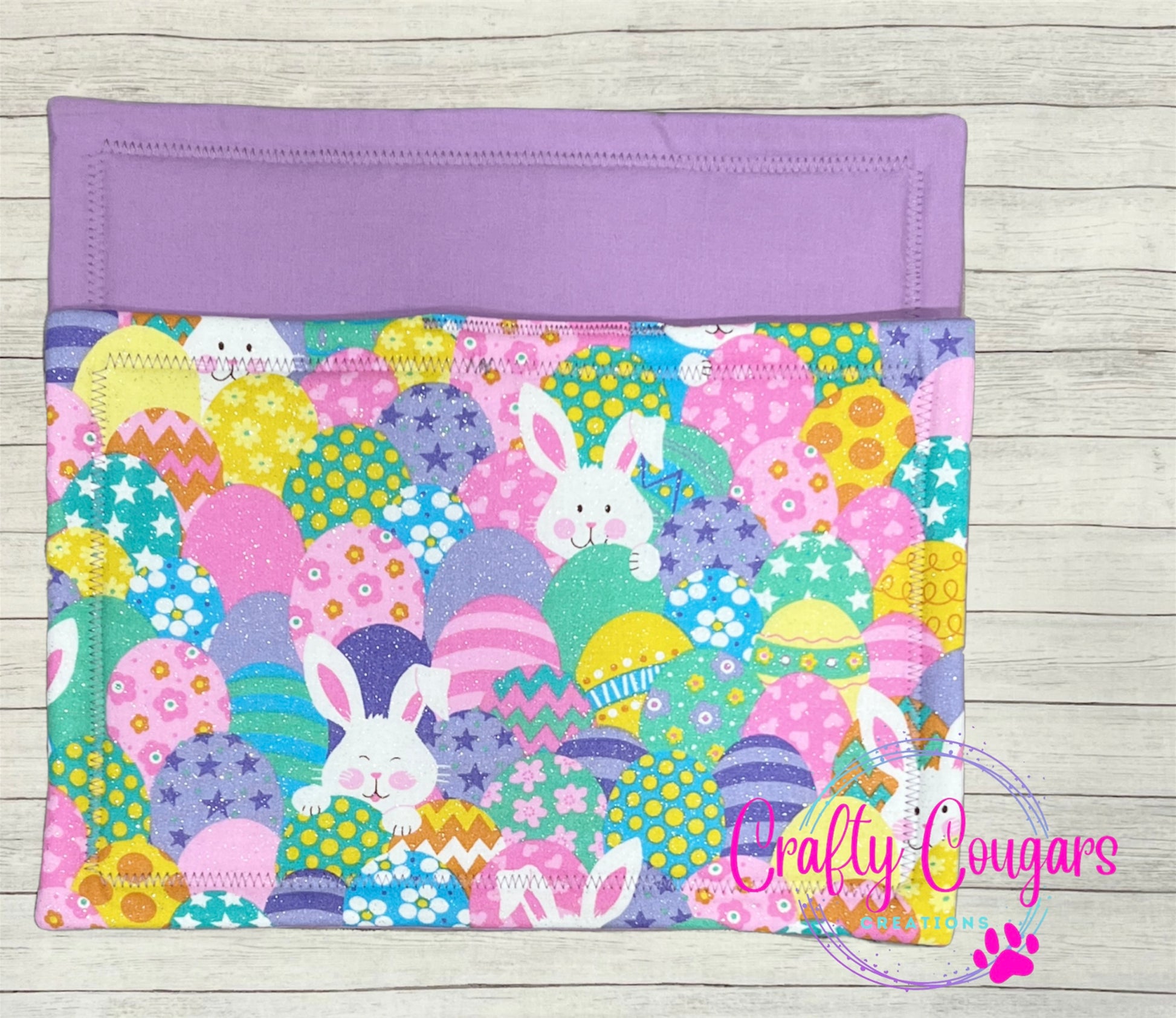 This casserole-sized pot holder features patterned Easter eggs and bunny rabbits on one side with a coordinating fabric on the other side.