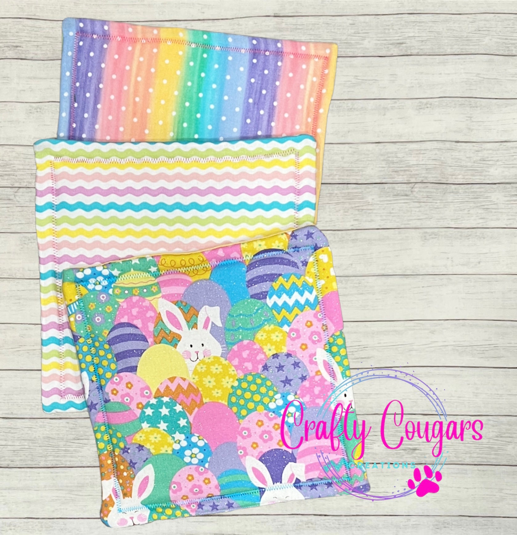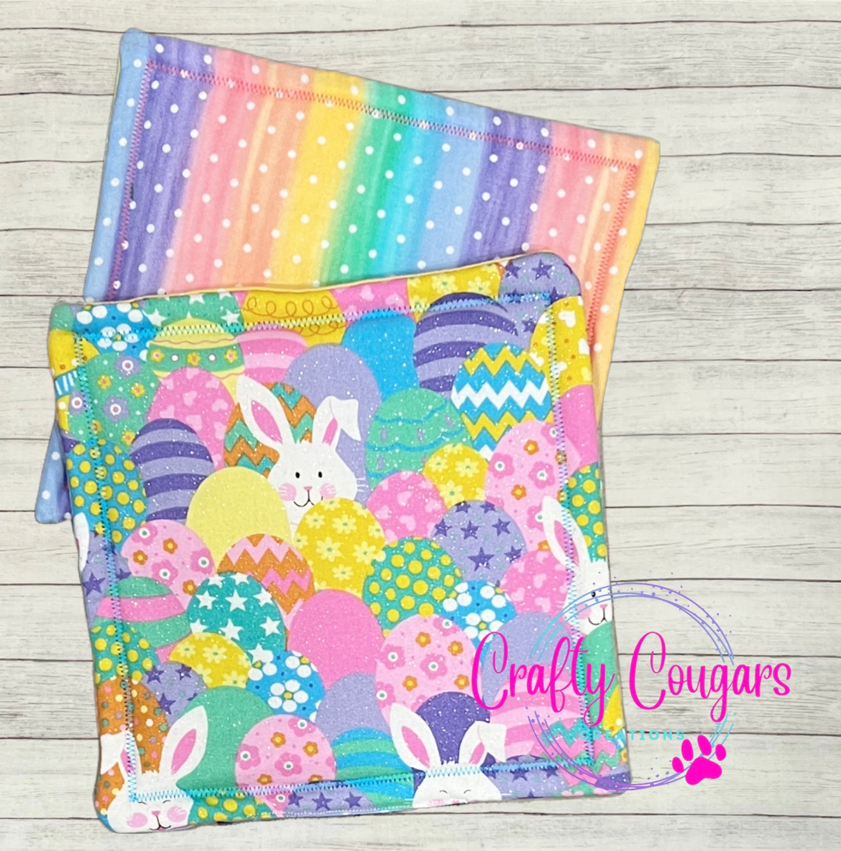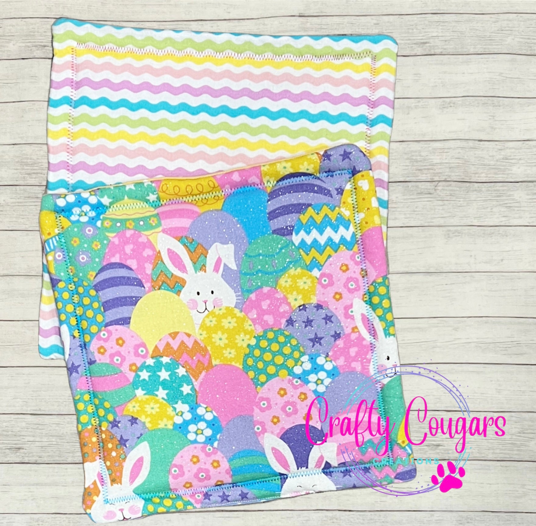 This standard-sized pot holder features patterned eggs and a bunny rabbit on one side and a coordinating fabric on the other side. You will find these very useful for protecting your countertops from heat. They are made with coordinating cotton fabrics on the front and back and 2 layers of insulated batting on the inside for heat resistance. These are sold as individual pot holders, not as a set. Each pot holder measures approximately 9 inches by 9 inches.