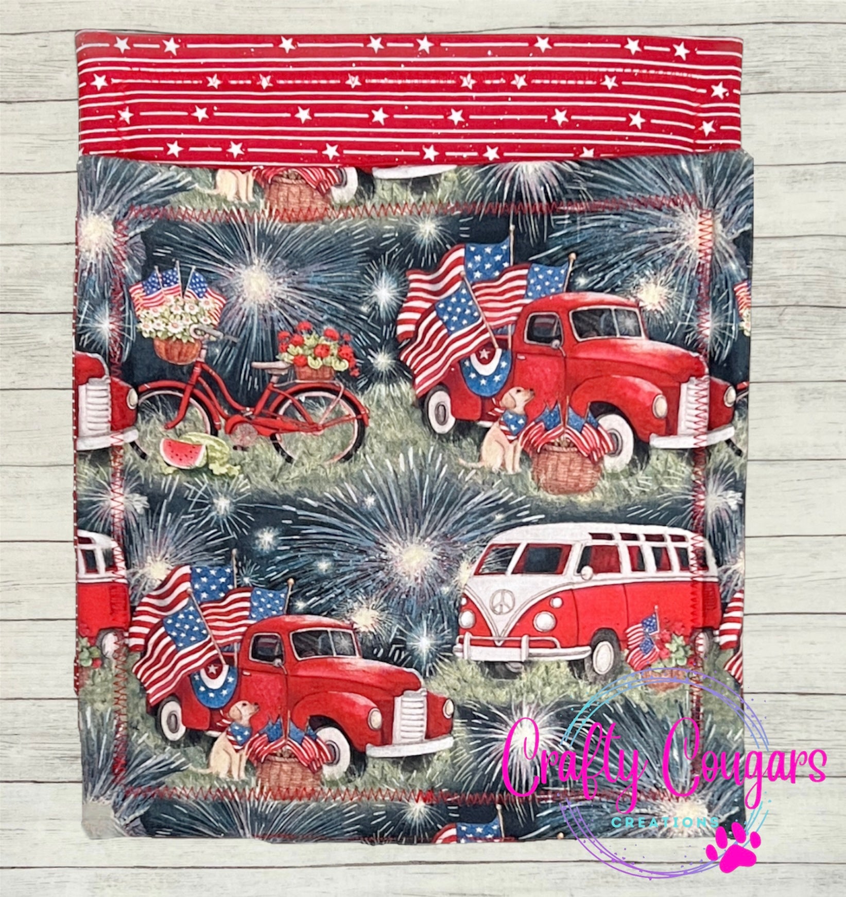 This pot holder is perfect for all of your patriotic holiday parties! It features fireworks with a red truck and van on one side and a coordinating glittery red with stars fabric on the back. You will find these very useful for protecting your countertops from heat. They are made with coordinating cotton fabrics on the front and back and 2 layers of insulated batting on the inside for heat resistance. These are sold as individual pot holders, not as a set. Each pot holder measures approximately 9 inches by 9 inches.