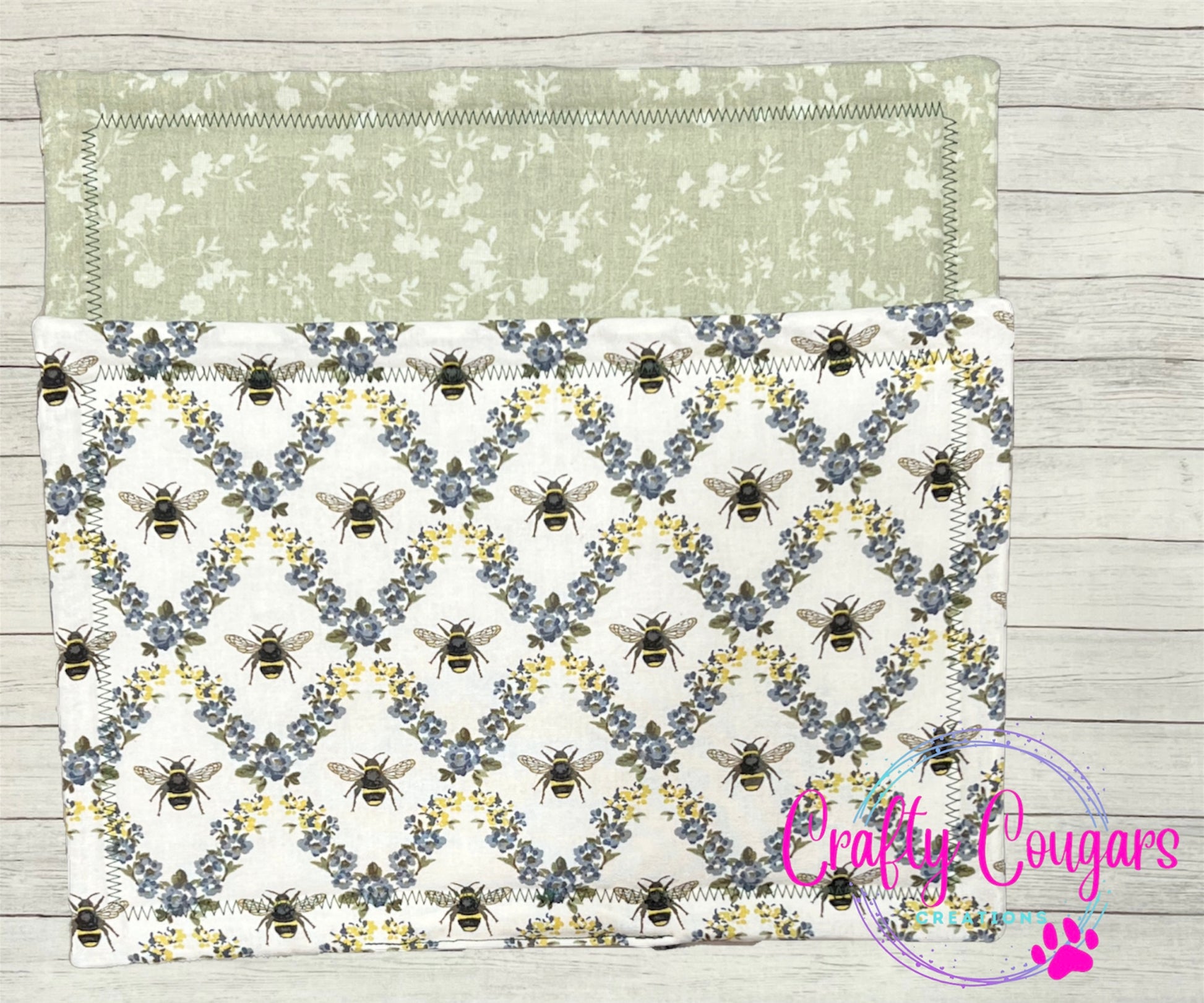 This casserole-sized pot holder features bees inside of a floral diamond frame on one side with a coordinating fabric on the other side.