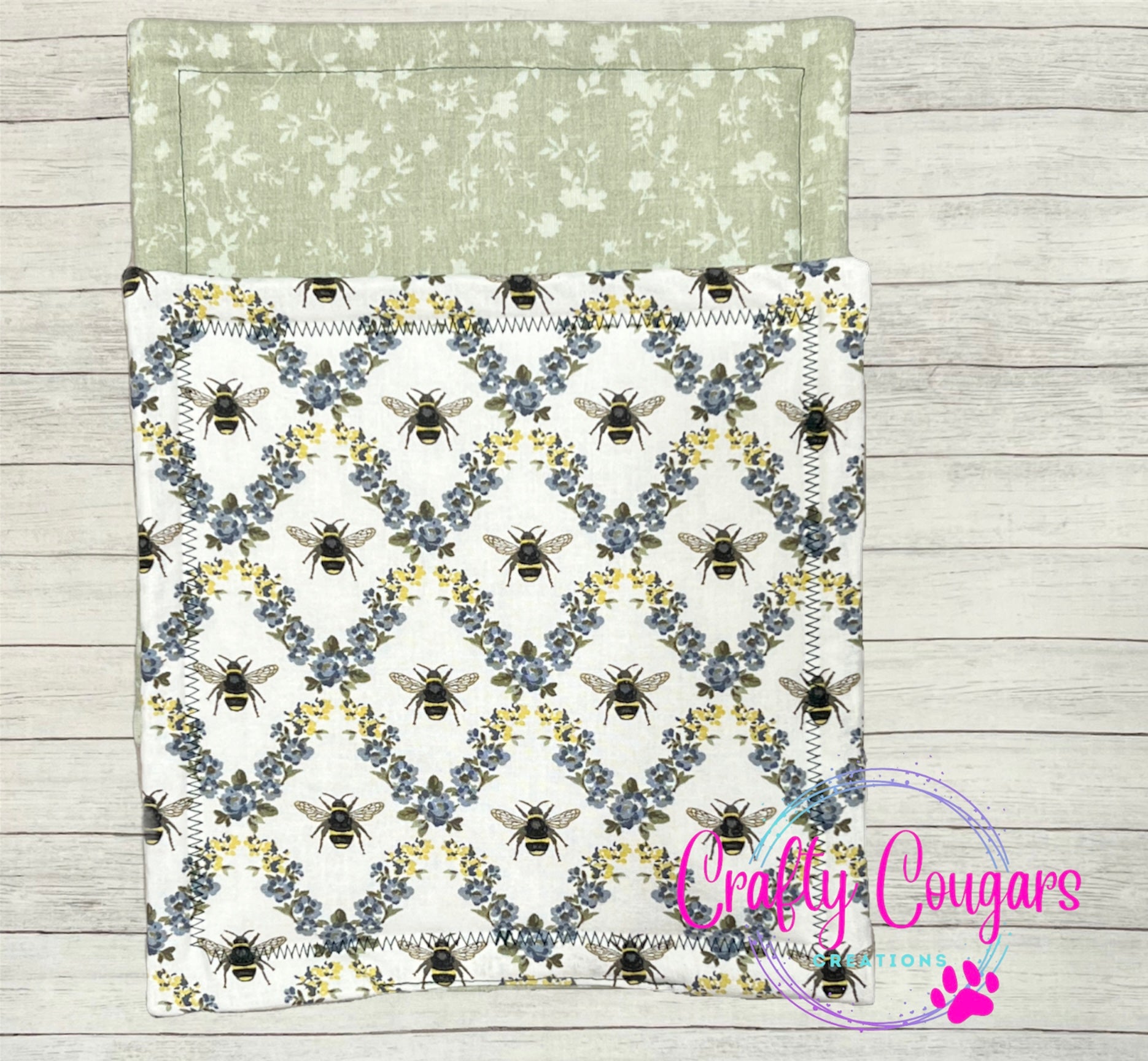 This standard-sized pot holder features bees with a floral pattern on one side and a coordinating fabric on the other side. You will find these very useful for protecting your countertops from heat. They are made with coordinating cotton fabrics on the front and back and 2 layers of insulated batting on the inside for heat resistance. These are sold as individual pot holders, not as a set. Each pot holder measures approximately 9 inches by 9 inches.
