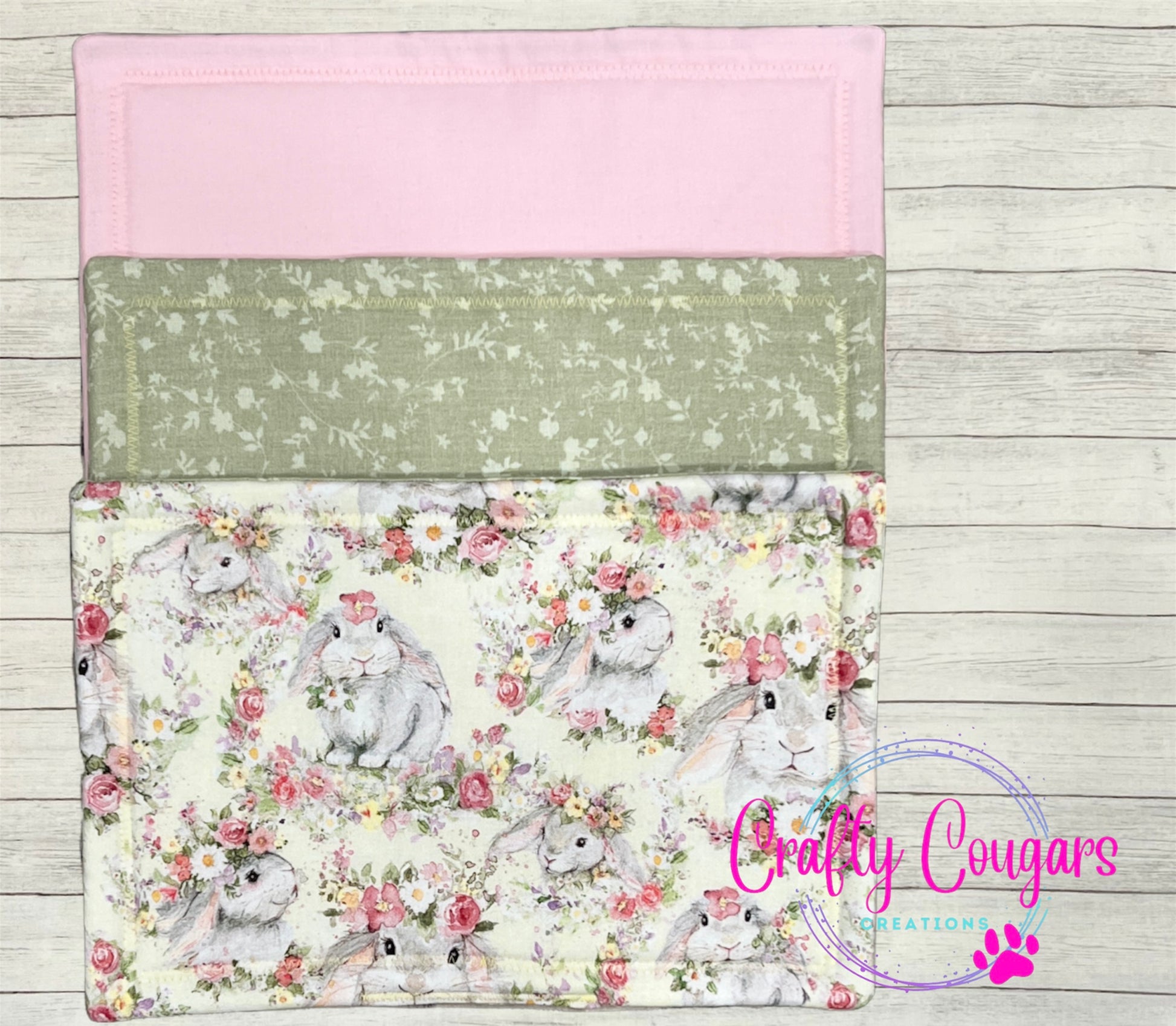 This casserole-sized pot holder features floral bunnies on one side with a coordinating fabric on the other side.