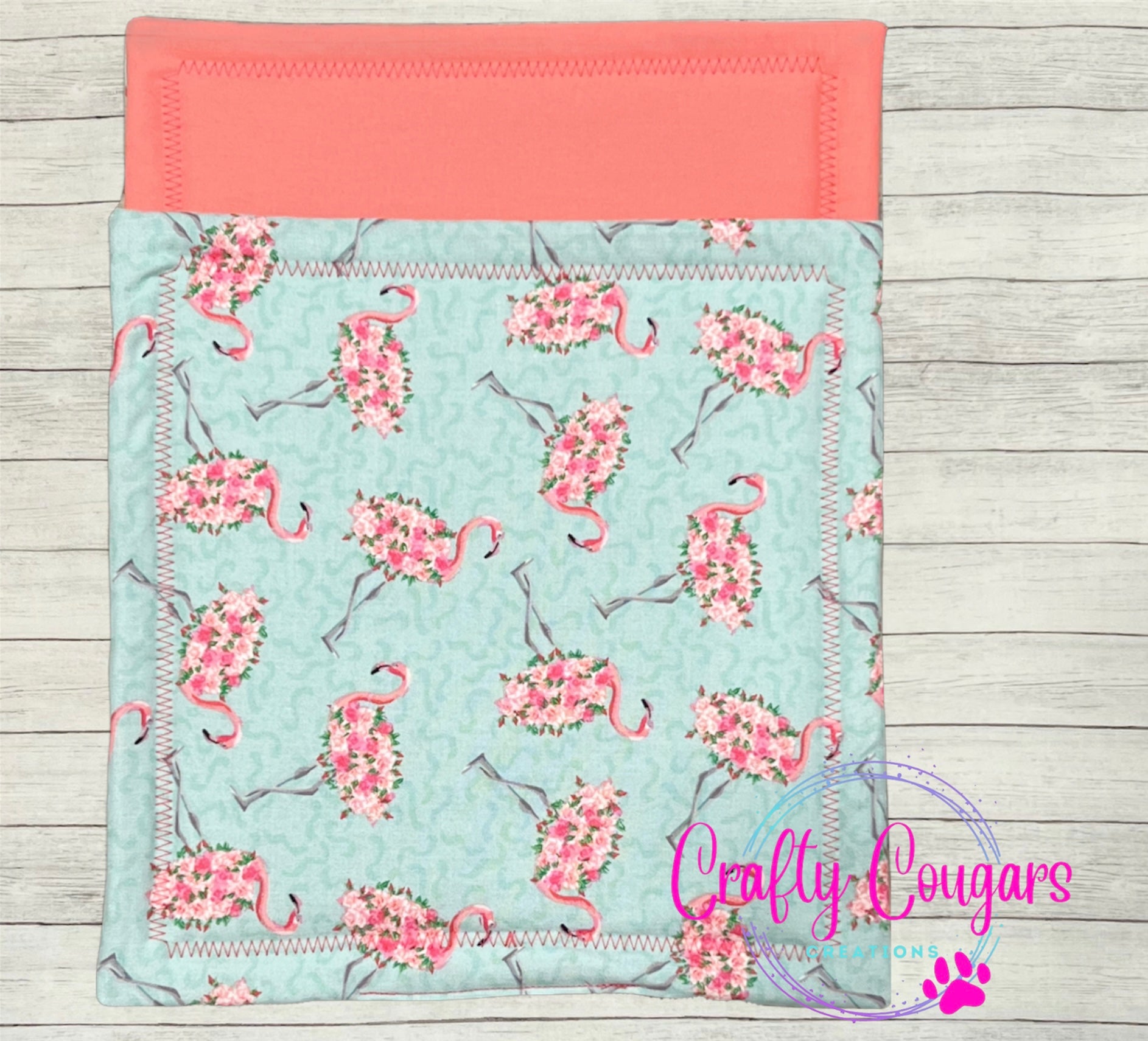 This standard-sized pot holder features pink floral flamingoes on one side and a coordinating fabric on the other side. You will find these very useful for protecting your countertops from heat. They are made with coordinating cotton fabrics on the front and back and 2 layers of insulated batting on the inside for heat resistance. These are sold as individual pot holders, not as a set. Each pot holder measures approximately 9 inches by 9 inches.