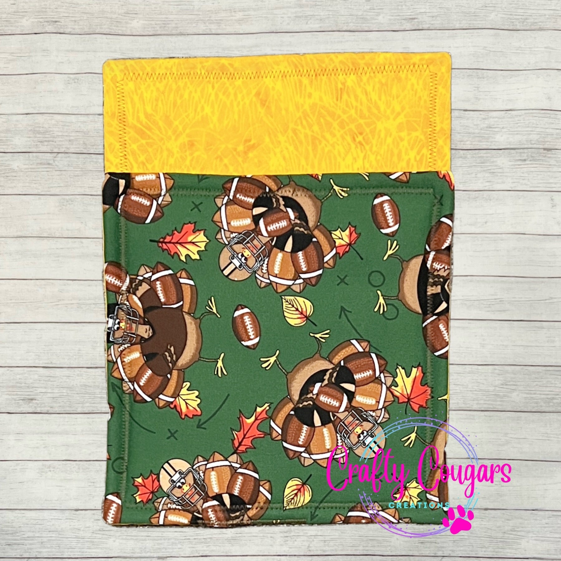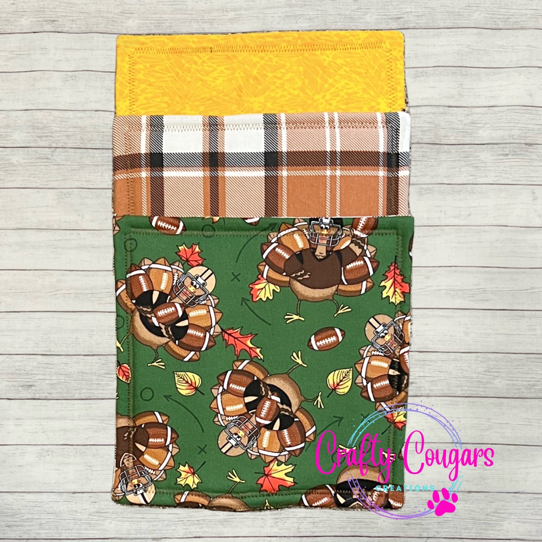 This pot holder has turkeys and footballs on one side with a coordinating fabric on the back. You will find these very useful for protecting your countertops from heat. They are made with coordinating cotton fabrics on the front and back and 2 layers of insulated batting on the inside for heat resistance. These are sold as individual pot holders, not as a set. Each pot holder measures approximately 9 inches by 9 inches.