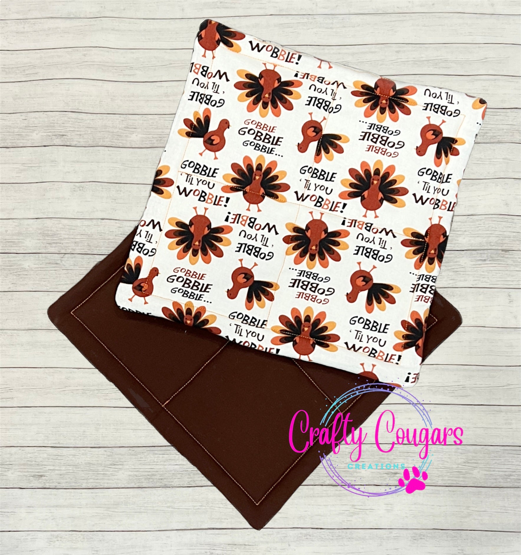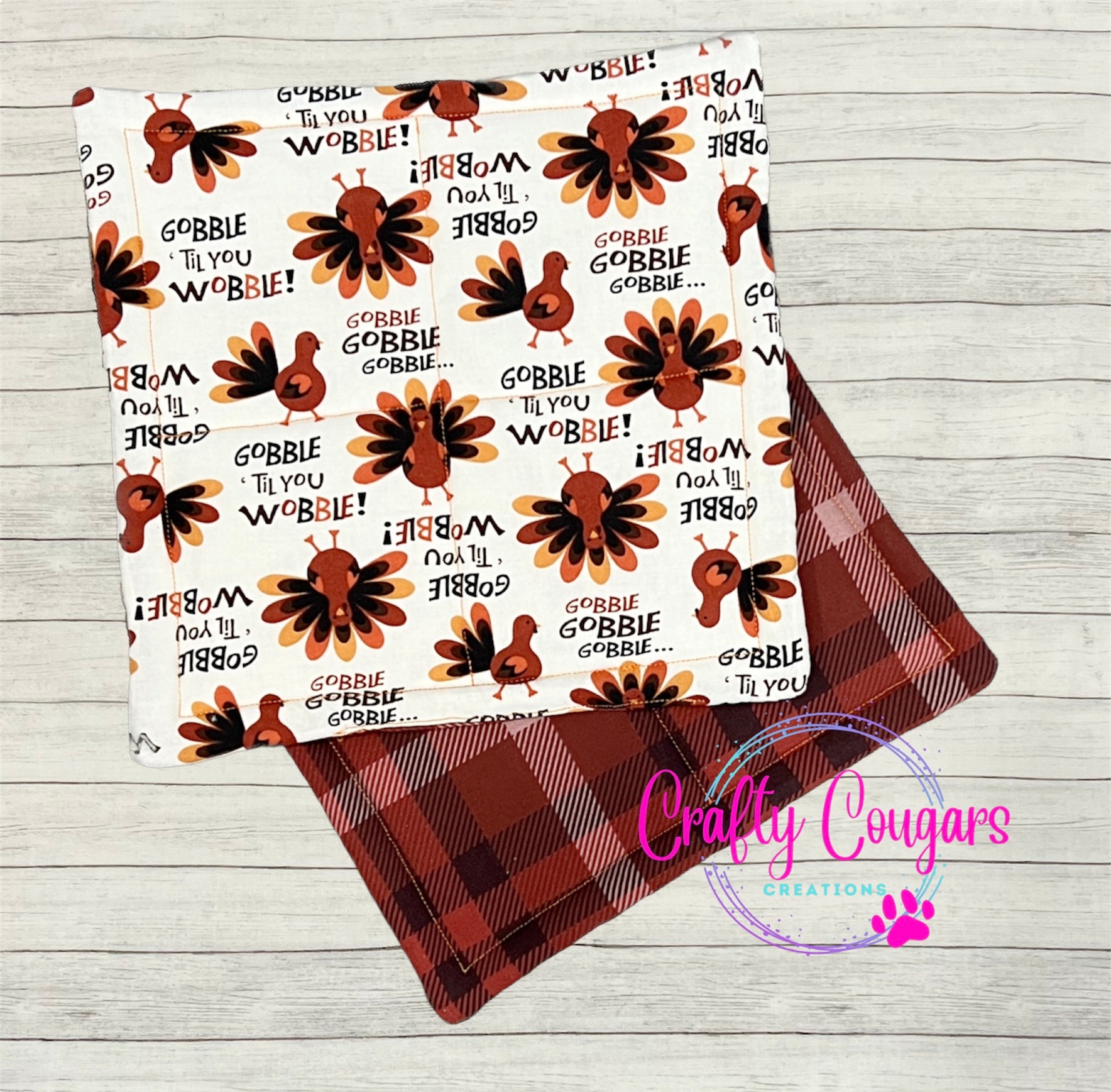 Gobble Til You Wobble! If you aren’t wobbling after Thanksgiving dinner, you didn’t eat enough food. These pot holders are available in brown plaid or solid brown.