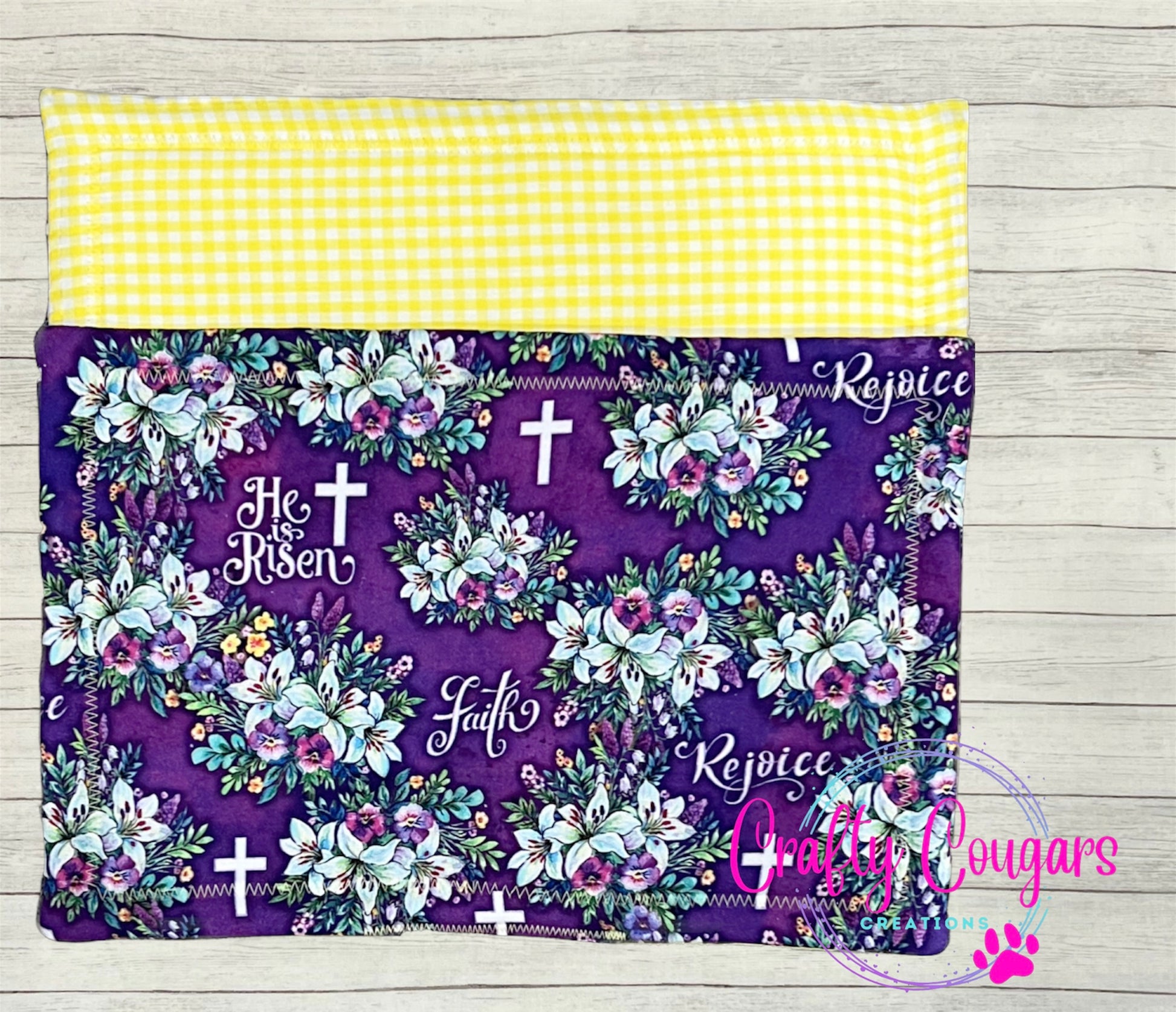 This casserole-sized pot holder features flowers and the Cross with the words “He Is Risen”, “ Rejoice” and “Faith” on one side with a coordinating fabric on the other side.