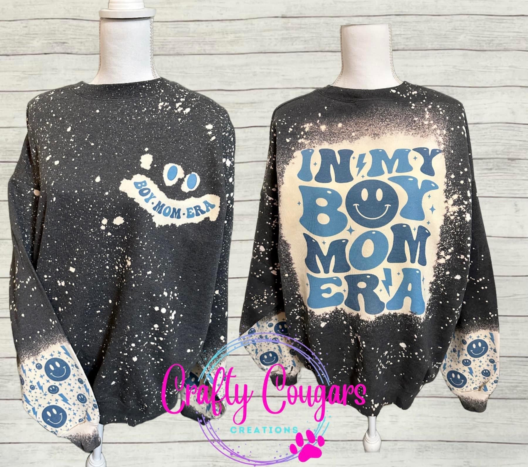 “In My Boy Mom Era” is a sublimation image that is pressed on a hand-bleached crewneck sweatshirt. The front features a small, pocket design and the back has a large image. The bottom of the sleeves are also bleached with a coordinating image featuring lightning bolts, stars and smiley faces. Our sweatshirts are unisex, very soft polyester/cotton blend and run true-to-size. Each sweatshirt has been pre-washed and pre-shrunk.