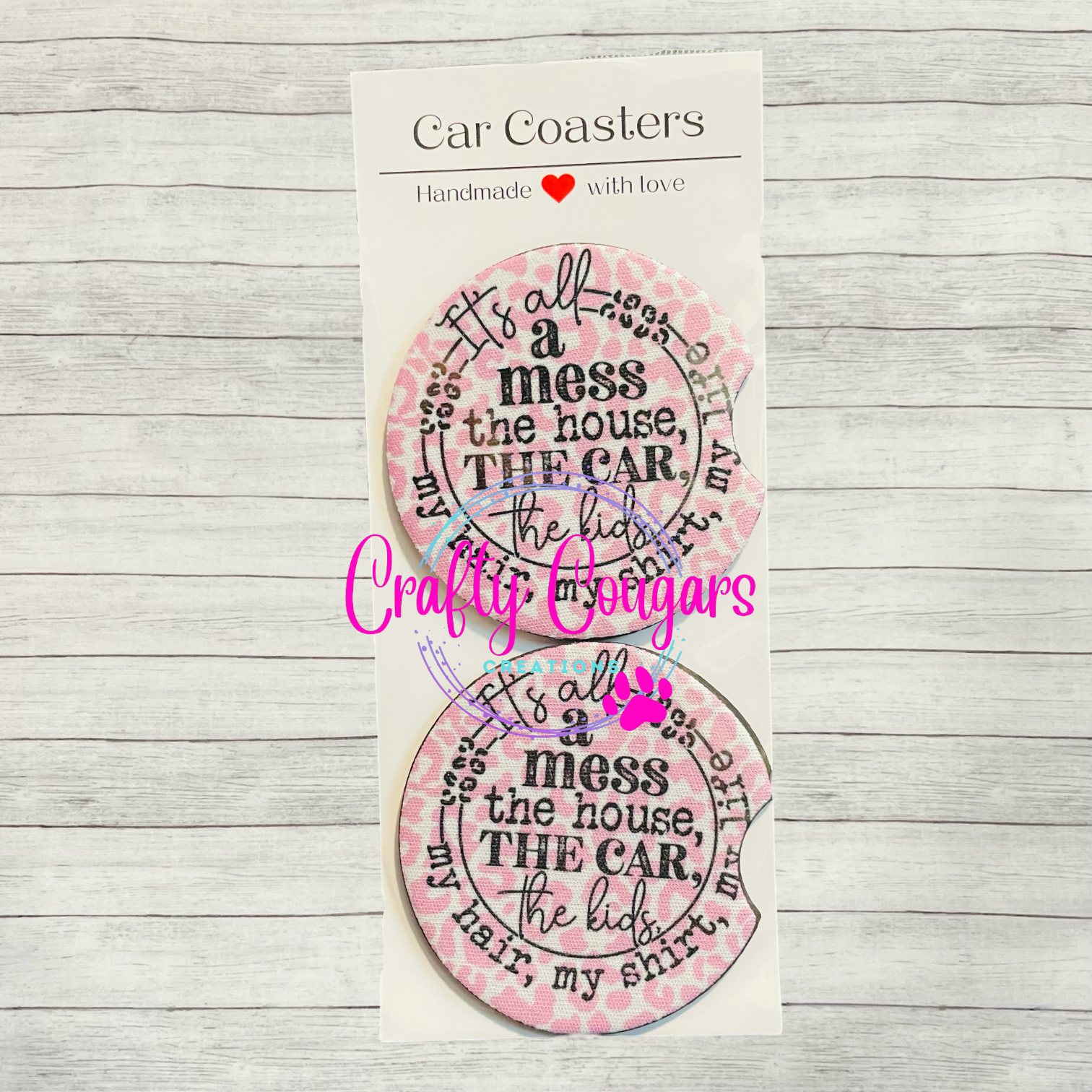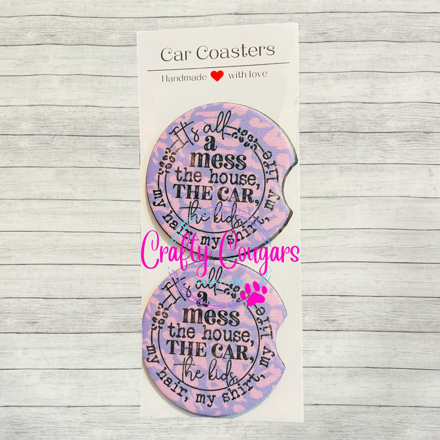 Mamas, we can all relate to this one! This adorable set of car coasters features “It’s All A Mess - The House, The Car, My Hair, My Shirt, My Life” against a leopard print background. These coasters are sure to keep your cup holders clean and stylish! They are made of a waterproof neoprene material that is great at soaking up drink sweat, dries quickly and can endure high heat. The image is printed with a special sublimation ink and the ink is heat pressed into the fibers of the coaster, ensuring they will not fade. These measure approximately 2.75 inches in diameter and are designed to fit in most vehicles’ cup holders.