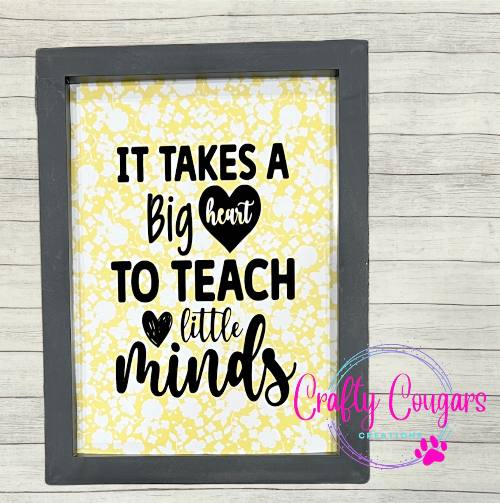 The “It Takes A Big Heart to Teach Little Minds” sign is enclosed in a 5 inch by 7 inch black frame with a yellow and white floral pattern as the background. This sign is best displayed on a shelf or desk.