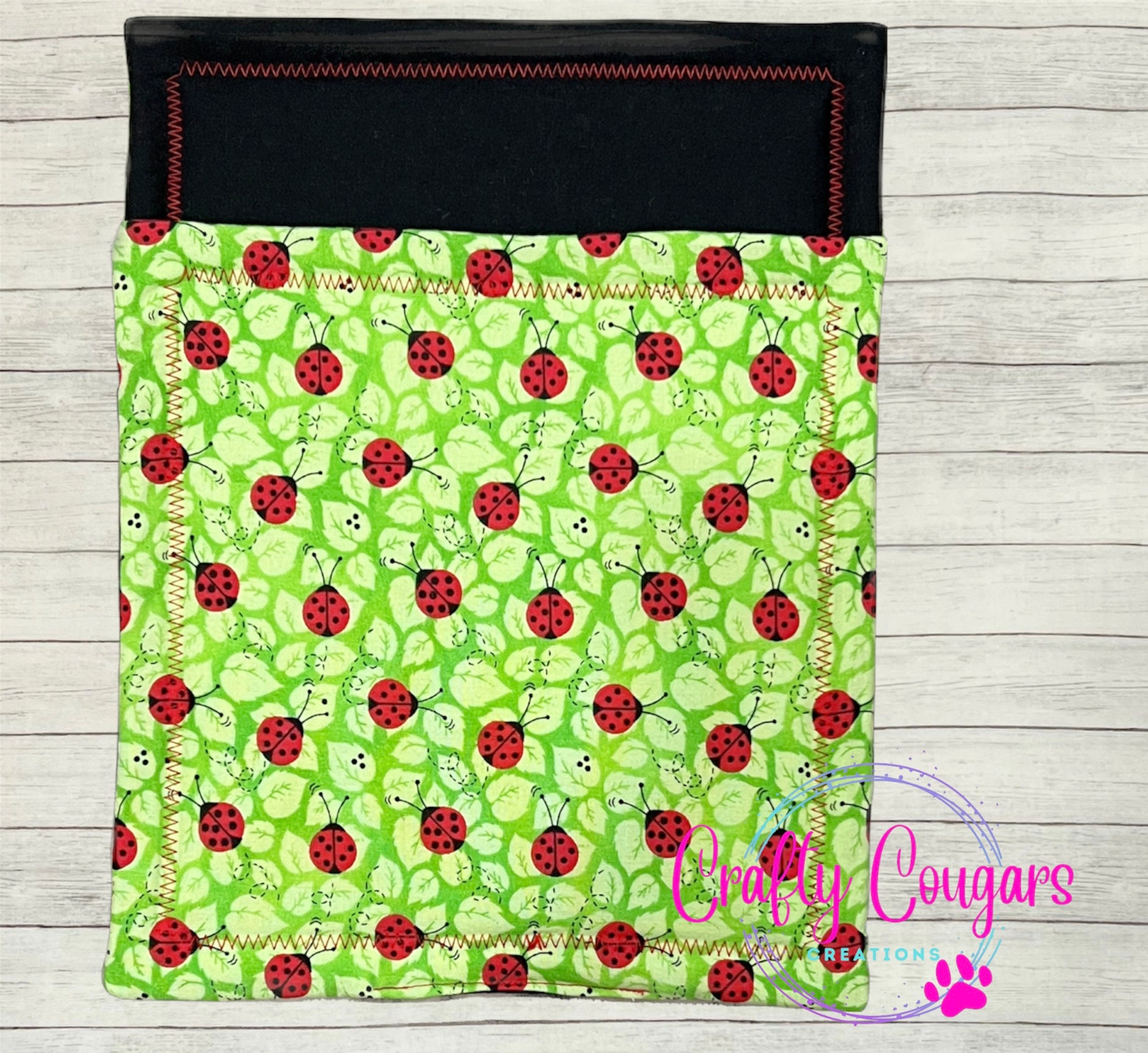 This standard-sized pot holder features cute ladybugs with green leaves on one side and a coordinating fabric on the other side. You will find these very useful for protecting your countertops from heat. They are made with coordinating cotton fabrics on the front and back and 2 layers of insulated batting on the inside for heat resistance. These are sold as individual pot holders, not as a set. Each pot holder measures approximately 9 inches by 9 inches.