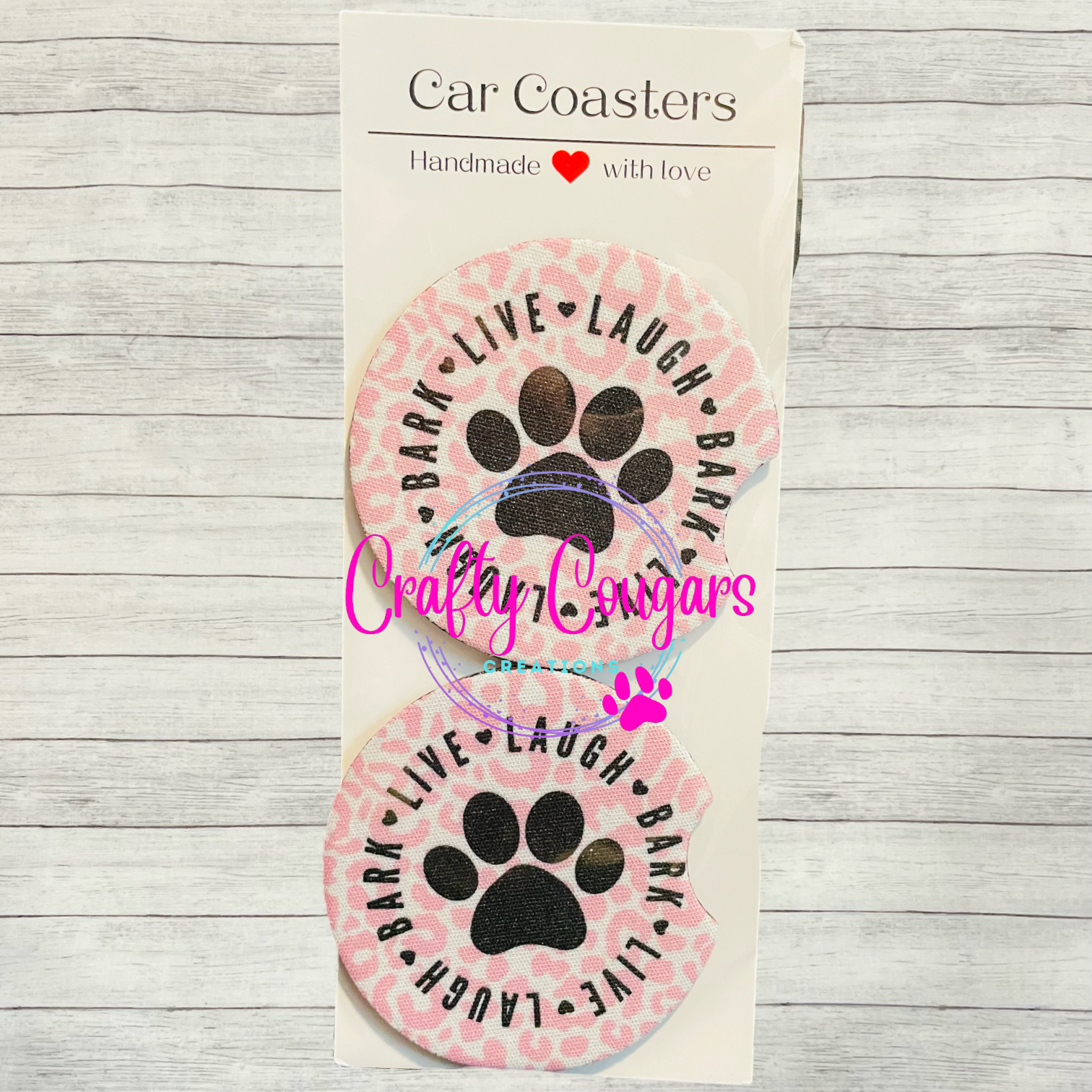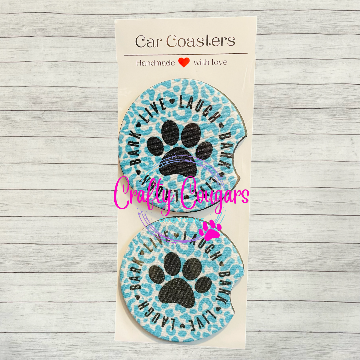 These adorable car coasters feature the phrase “Live Love Bark” with a paw print against a leopard print background.. They come in a set of 2 and are sure to keep your cup holders clean and stylish. They are made of a waterproof neoprene material that is great at soaking up drink sweat, dries quickly and can endure high heat. The image is printed with a special sublimation ink and the ink is heat pressed into the fibers of the coaster, ensuring they will not fade. These measure approximately 2.75 inches in diameter and are designed to fit in most vehicles’ cup holders. Choose between pink or teal leopard print.