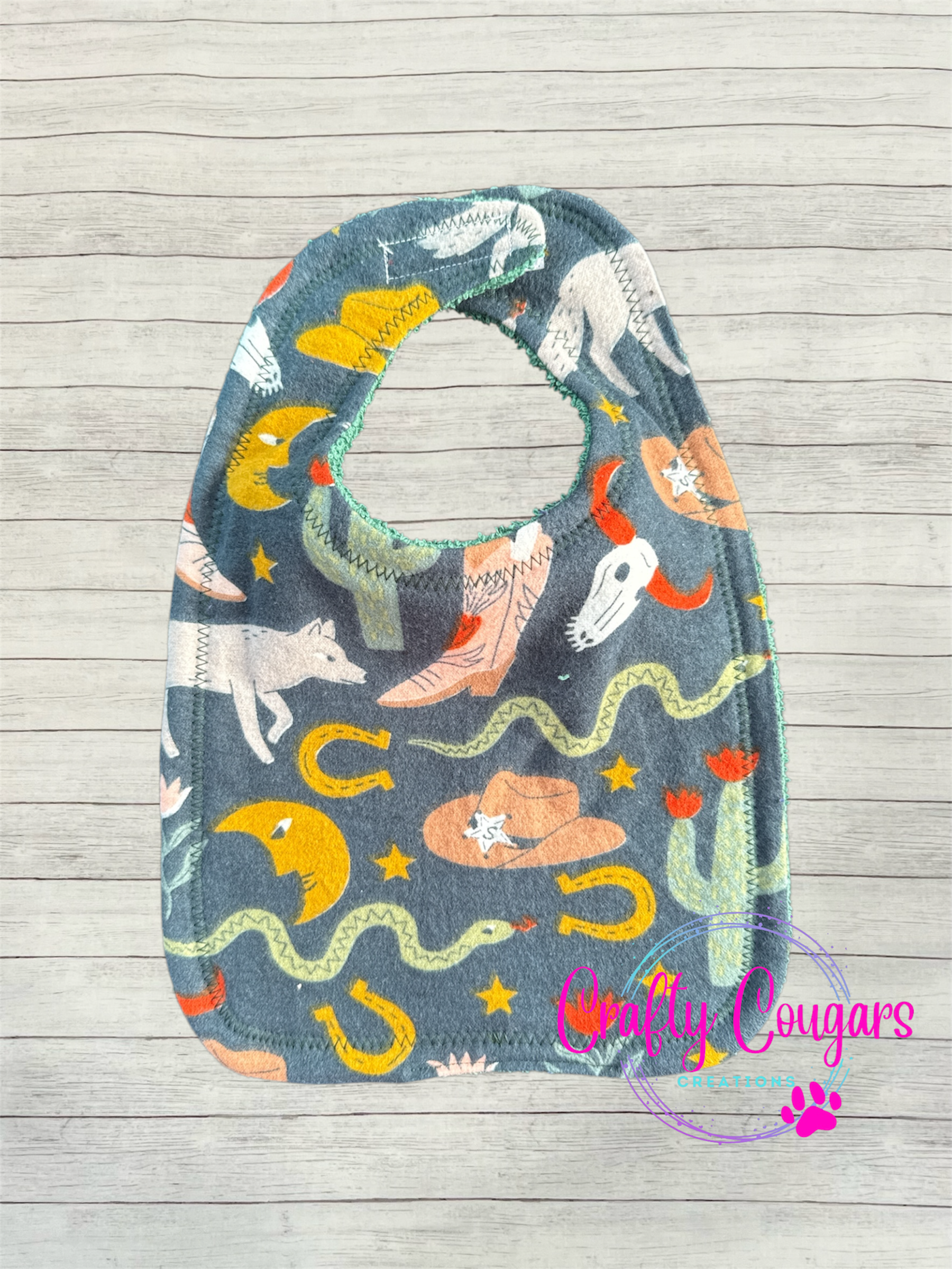 This bib offers KAM snap closures that are adjustable and allow our bibs to grow with your child. Our bibs are made with 100% cotton flannel and terry cloth. The bib measures approximately 8.5” x 12”.
