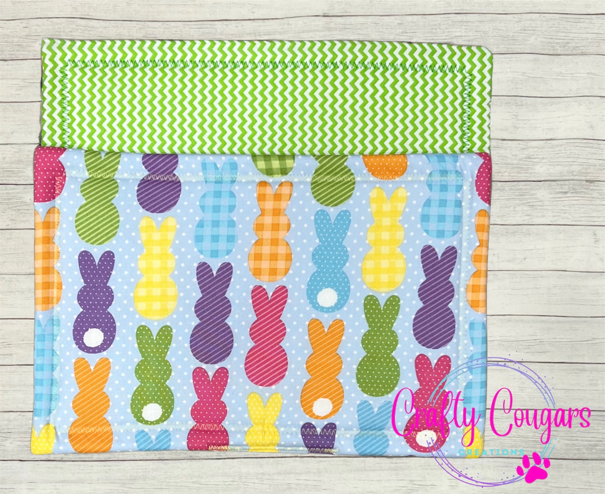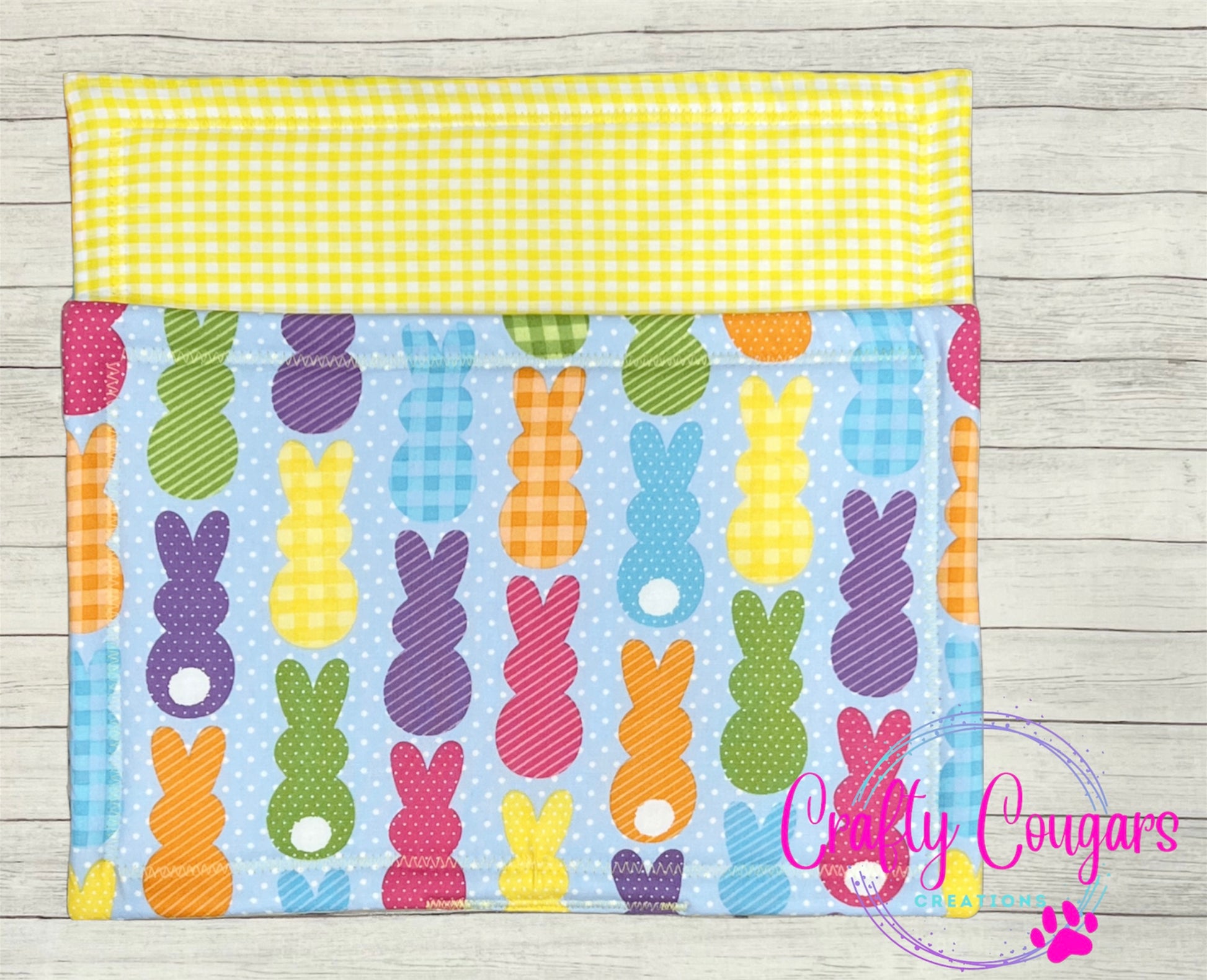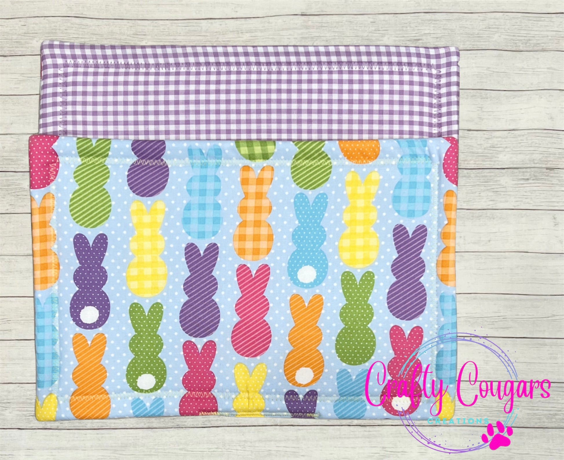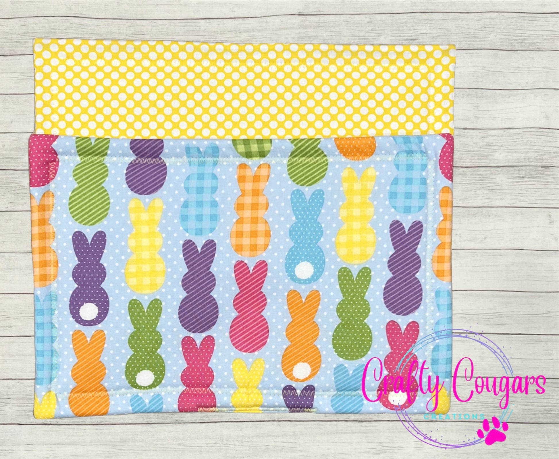 This casserole-sized pot holder features patterned bunny rabbits on one side with a coordinating fabric on the other side.