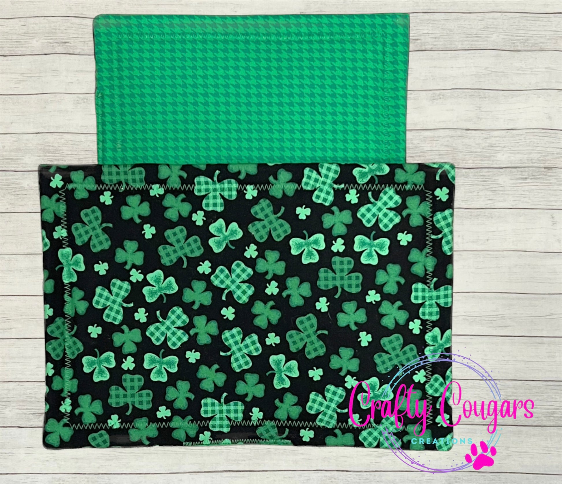 This casserole-sized pot holder features patterned shamrocks on one side with a coordinating fabric on the other side.