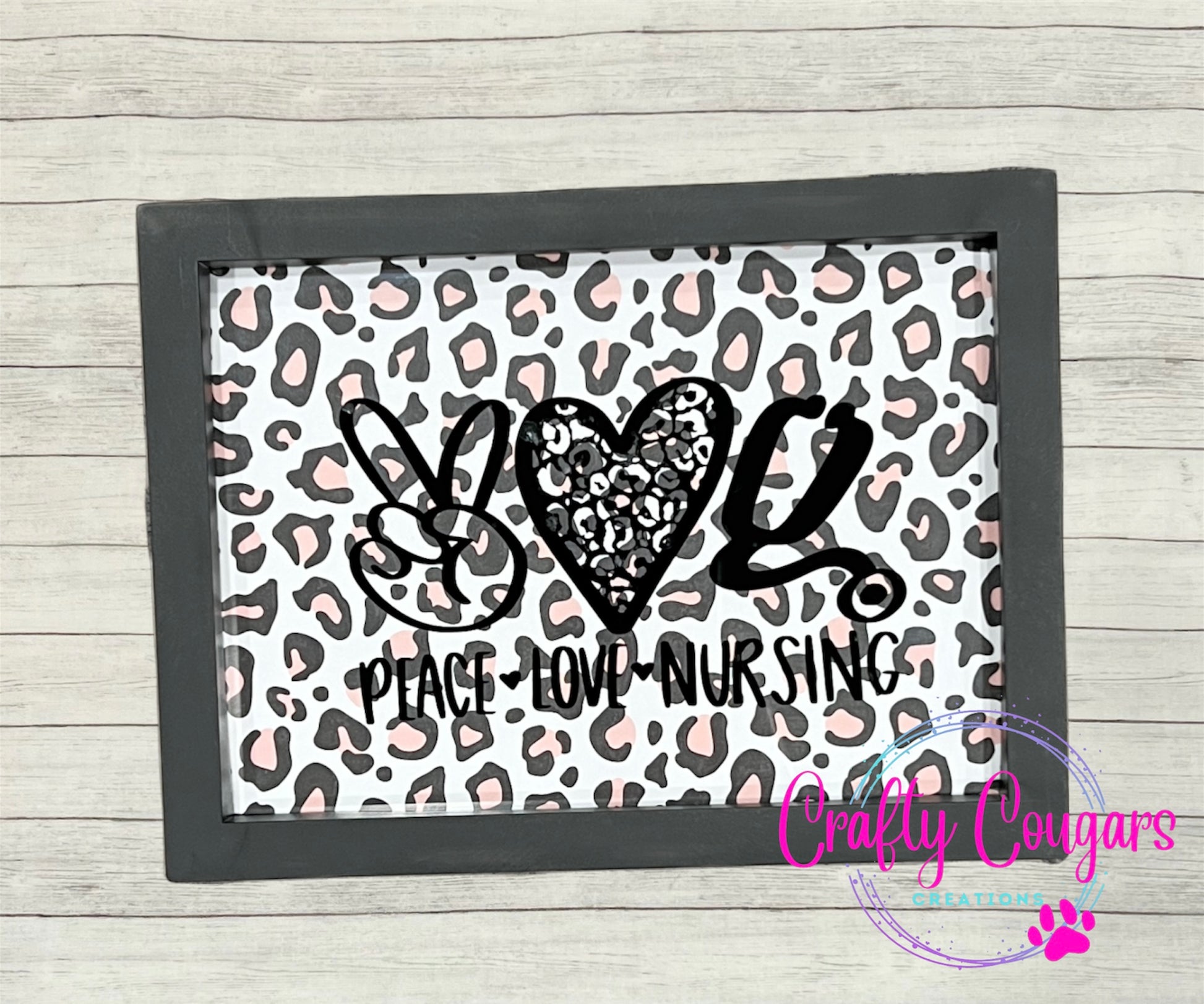 The “Peace, Love, Nursing” sign is enclosed in a 5 inch by 7 inch black frame with a pink and black leopard print pattern as the background. This sign is best displayed on a shelf or desk.
