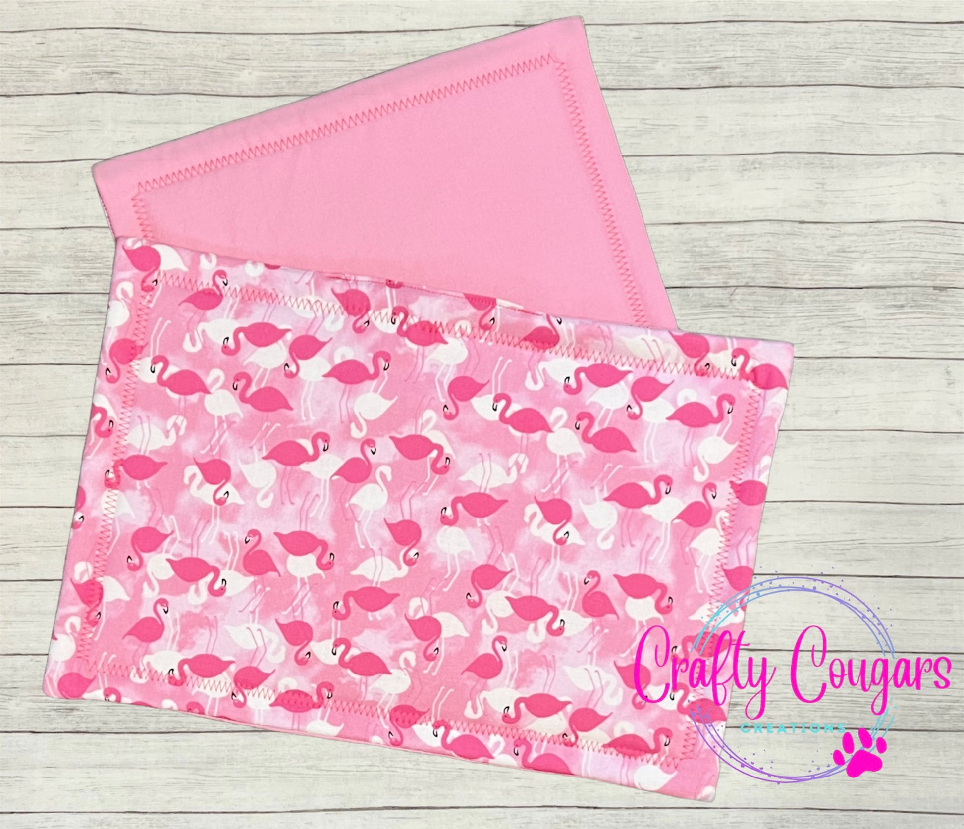 This casserole-sized pot holder features pink & white flamingoes on one side with a coordinating fabric on the opposite side.