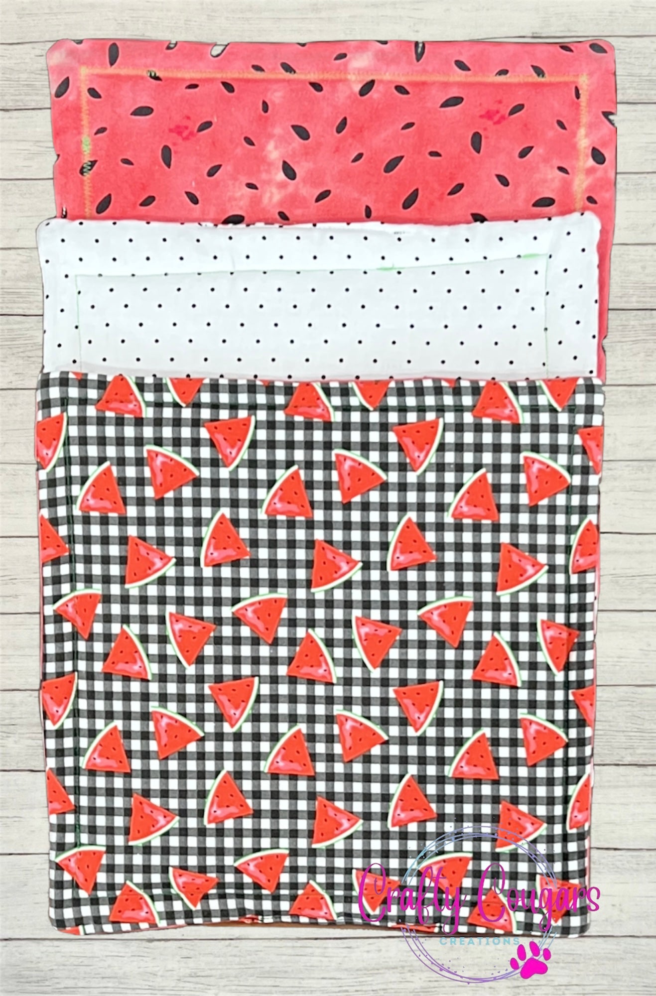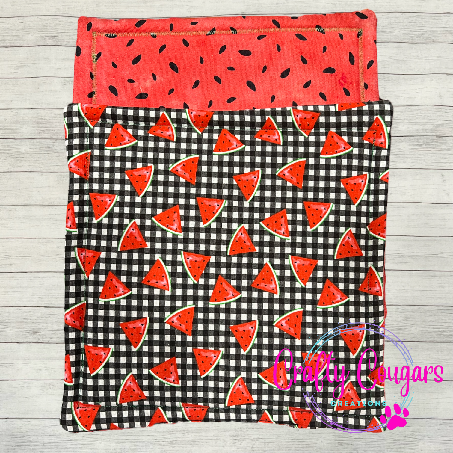 This pot holder screams picnic time! It features watermelon slices against a black and white plaid background. You will find these very useful for protecting your countertops from heat. They are made with coordinating cotton fabrics on the front and back and 2 layers of insulated batting on the inside for heat resistance. These are sold as individual pot holders, not as a set. Each pot holder measures approximately 9 inches by 9 inches.