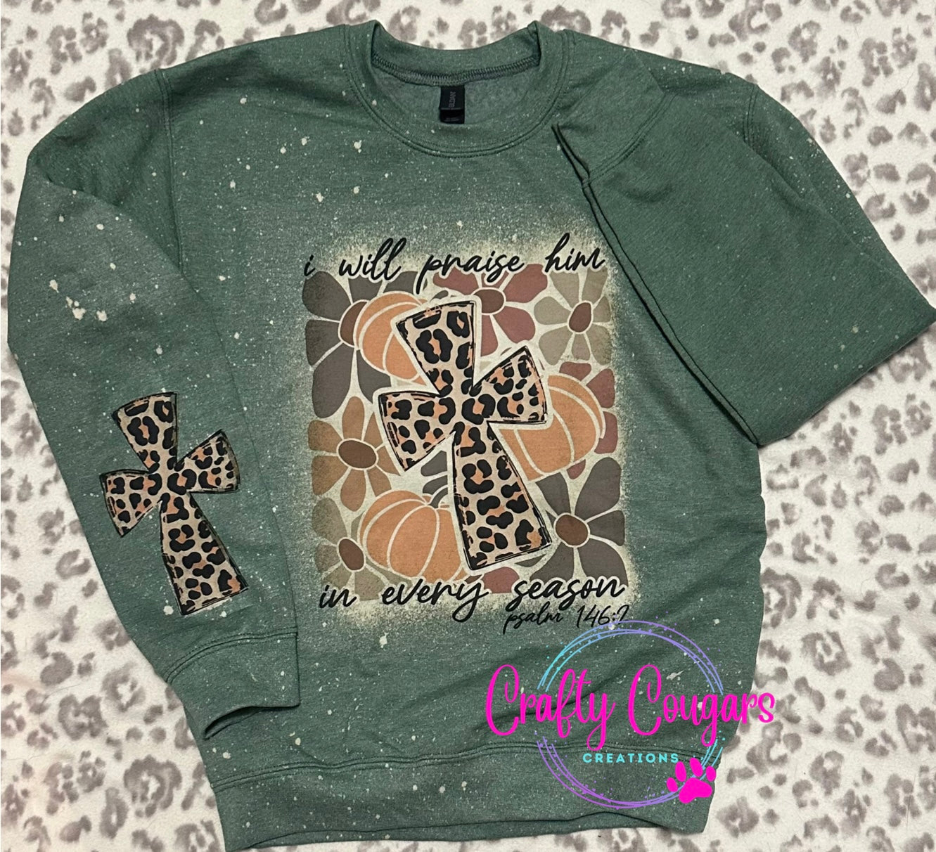 “I will praise him in every season” is a sublimation image that is pressed on a hand-bleached crewneck sweatshirt. Our sweatshirts are unisex, very soft polyester/cotton blend and run true-to-size. Each sweatshirt has been pre-washed and pre-shrunk.