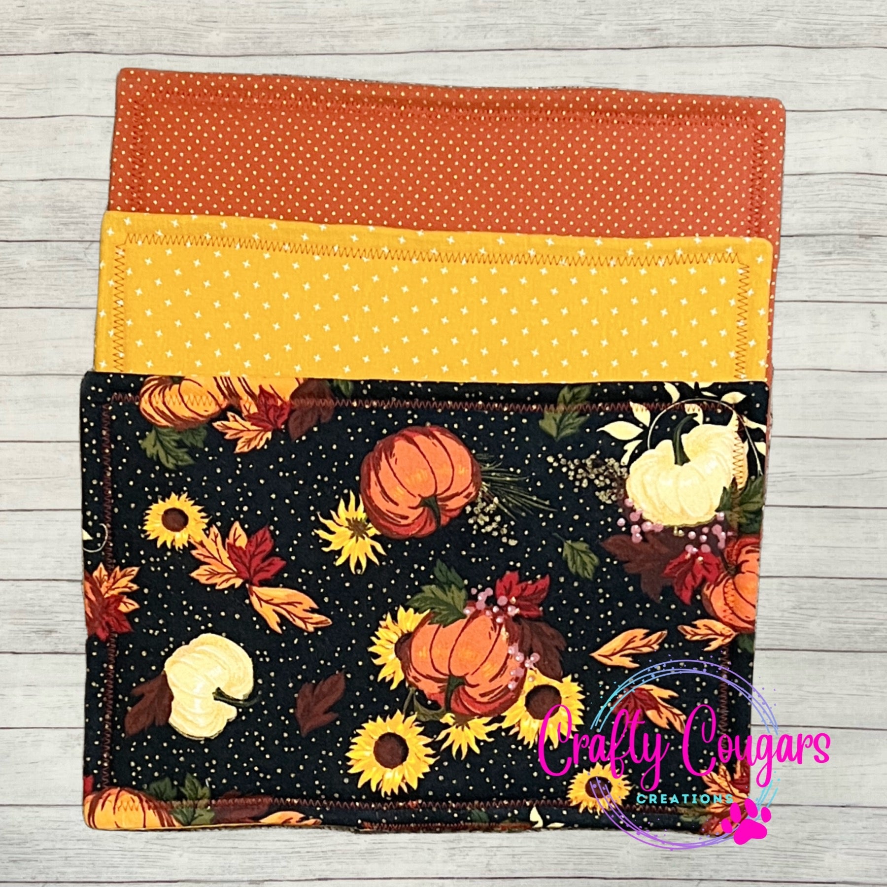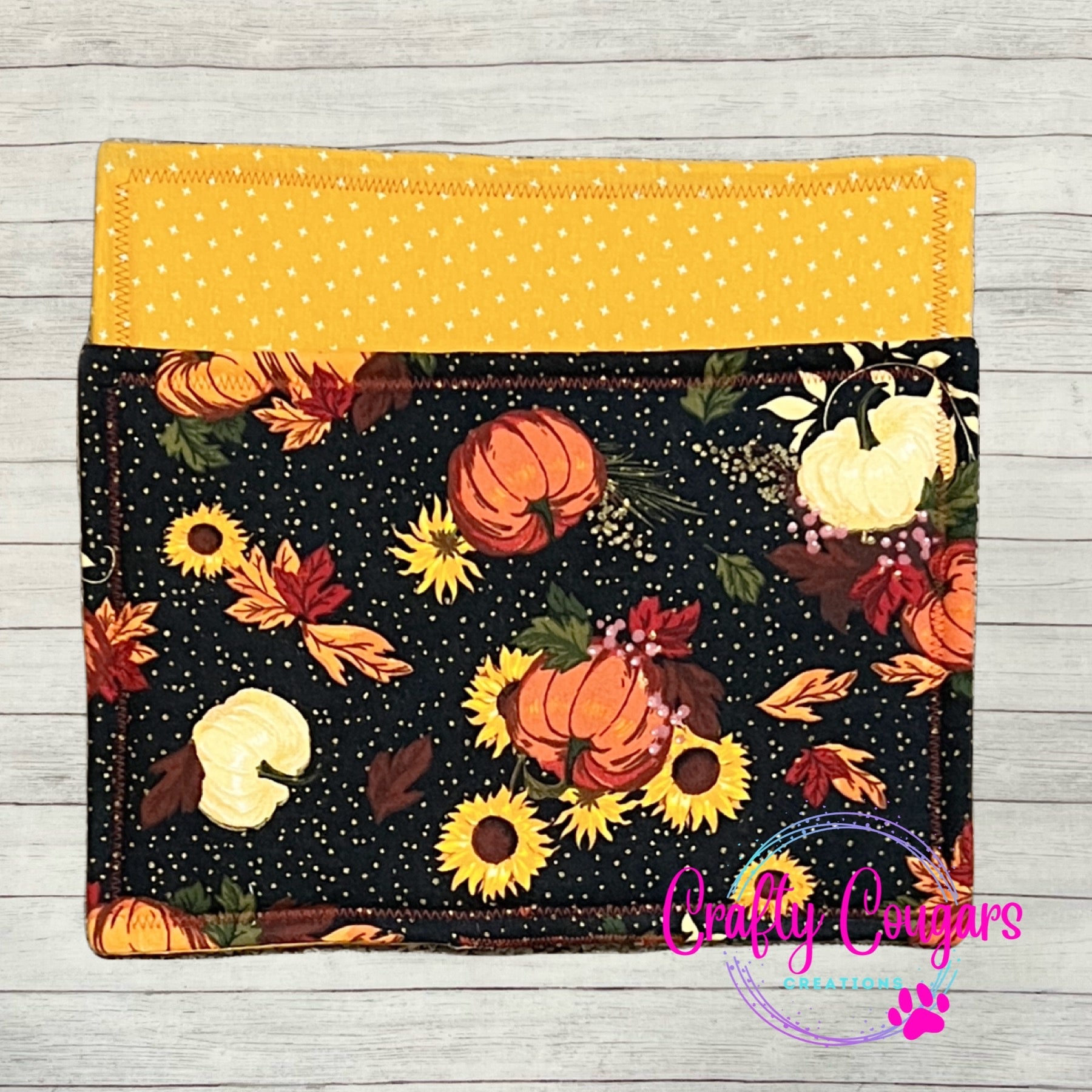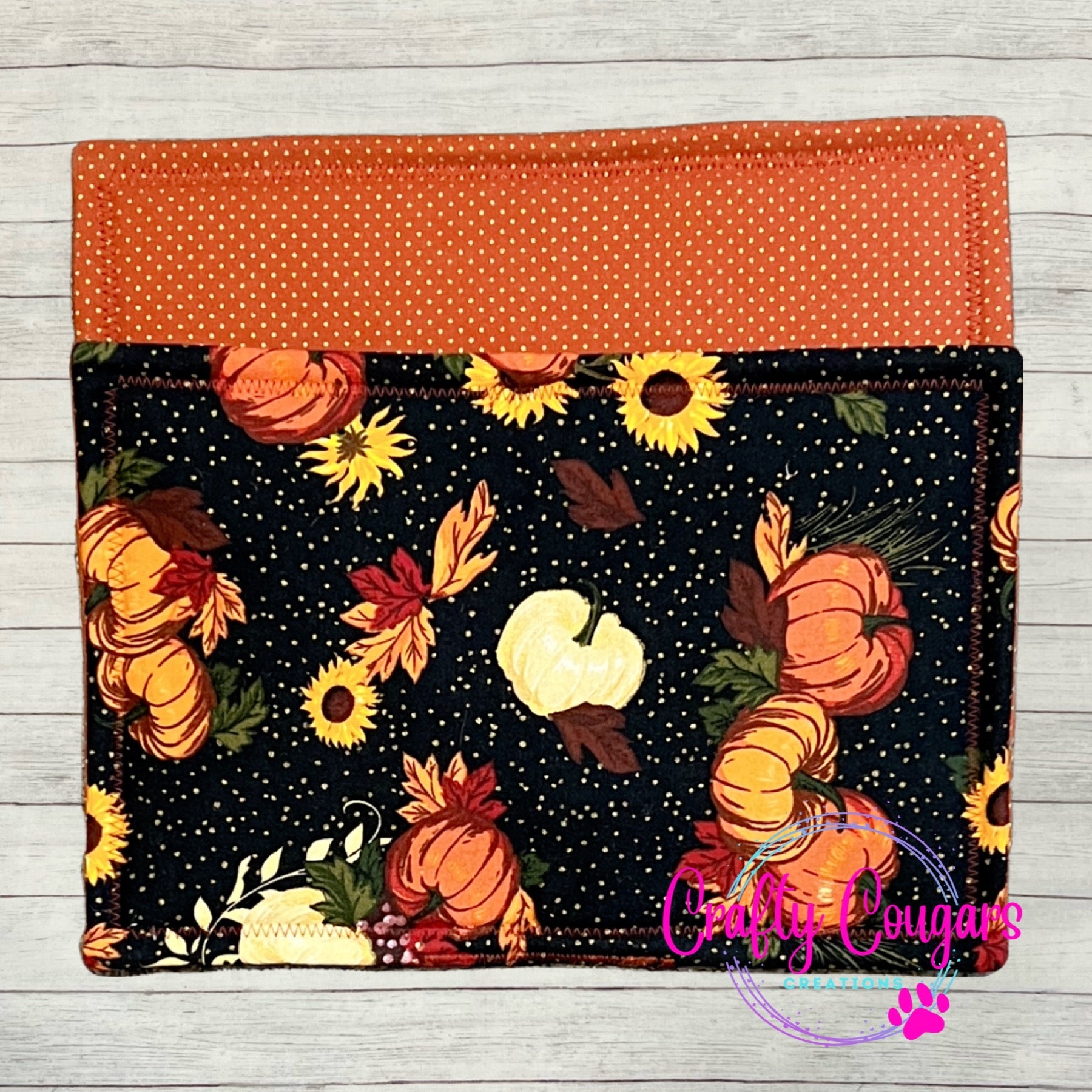 This casserole-sized pot holder features a pumpkins, sunflowers and fall leaves on one side with a coordinating fabric on the other side.