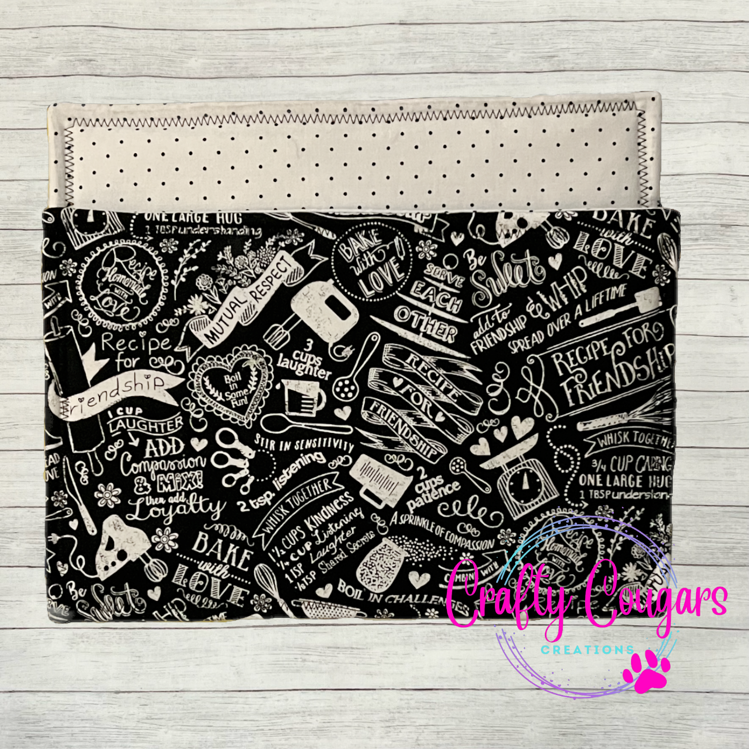 This casserole-sized pot holder features the recipe for friendship on one side with a coordinating white with black polka dots fabric on the other side.