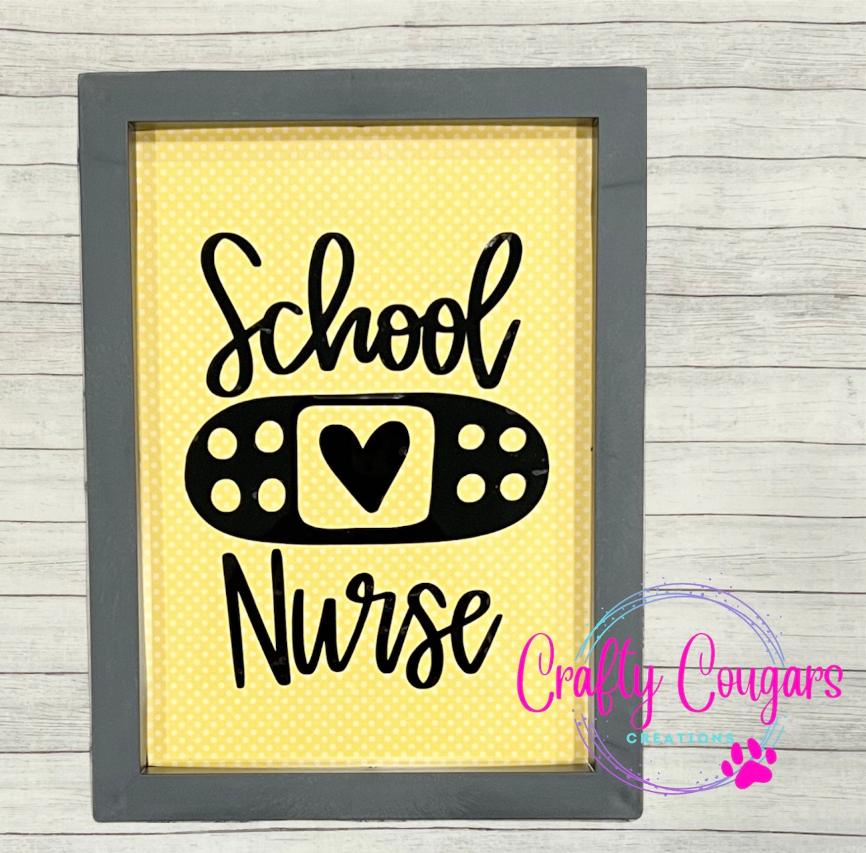 The “School Nurse” sign is enclosed in a 5 inch by 7 inch black frame with a yellow with white polka dots pattern as the background. This sign is best displayed on a shelf or desk.