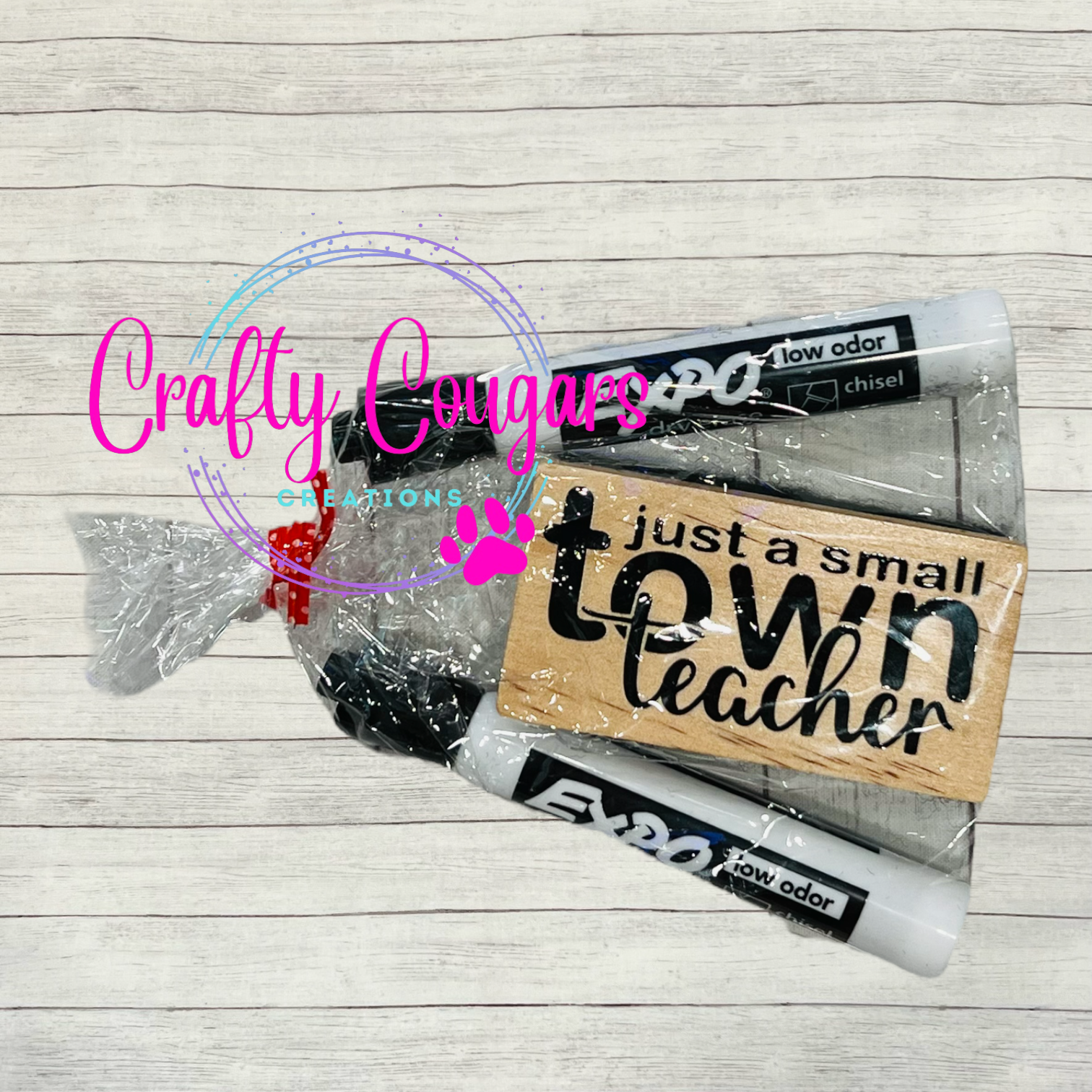 Our eraser sets are the perfect gift for your favorite teacher! The eraser reads, “Just a small town teacher” in black, permanent vinyl and sealed with multiple coats of Polycrylic Protective Finish.