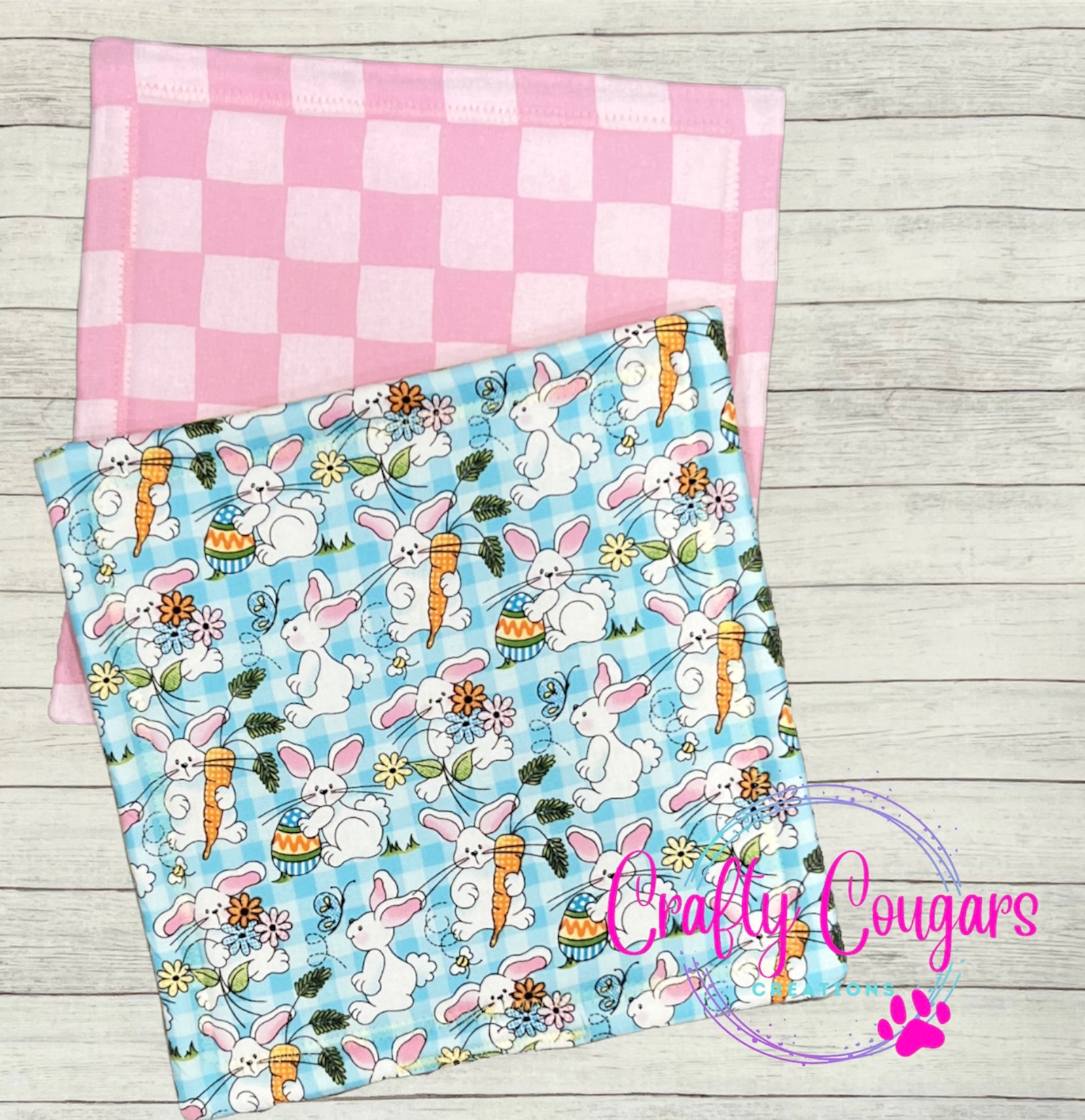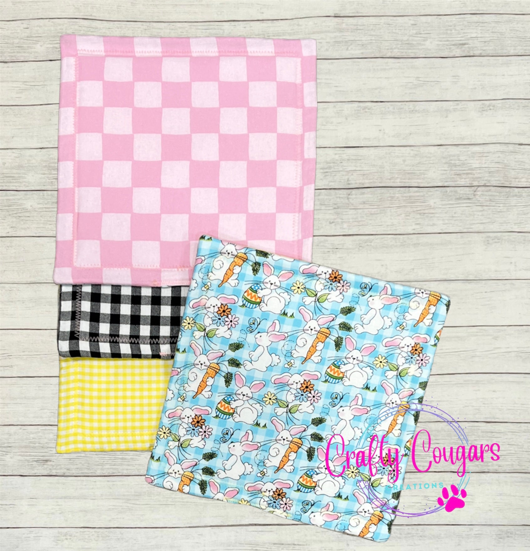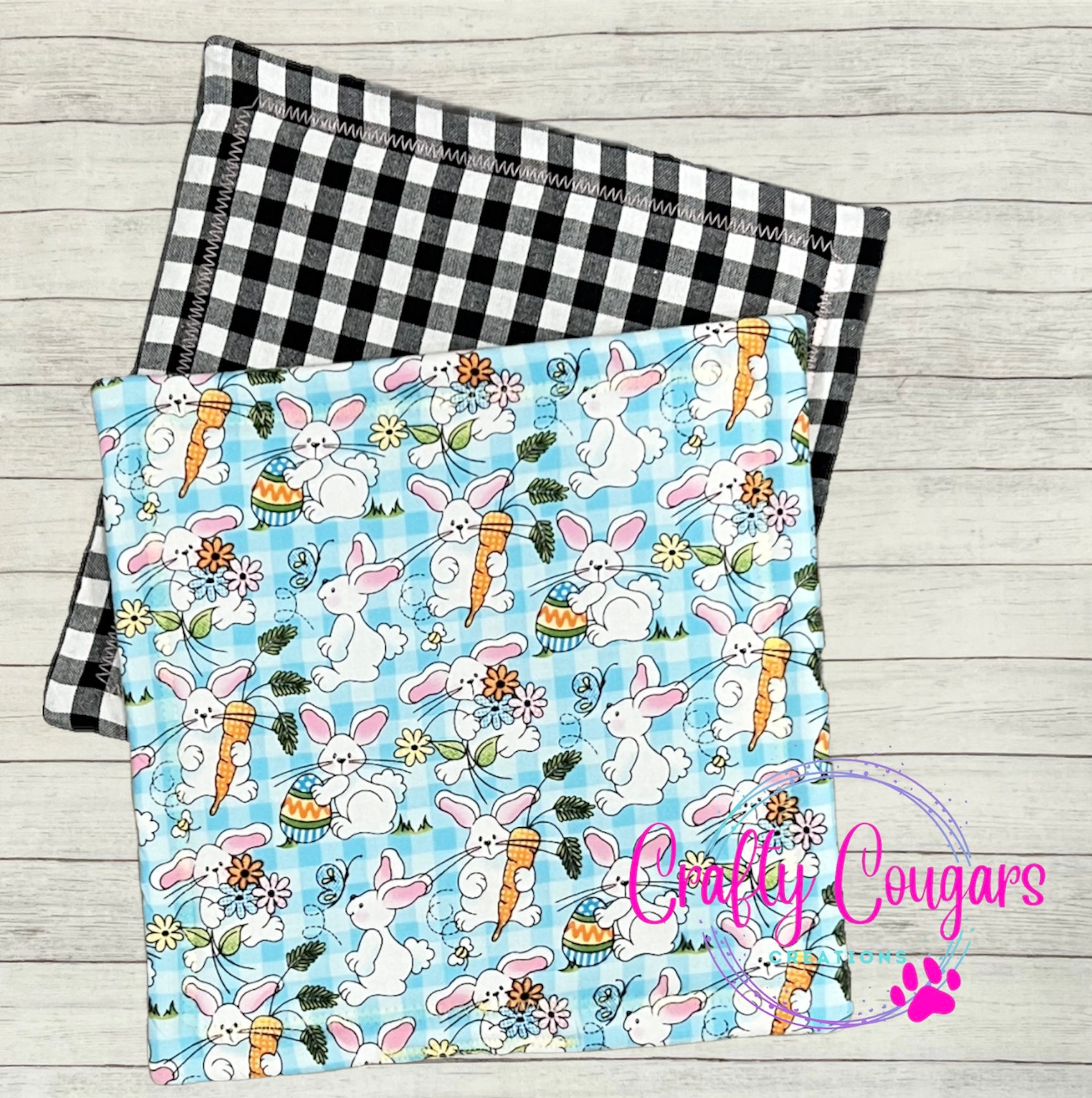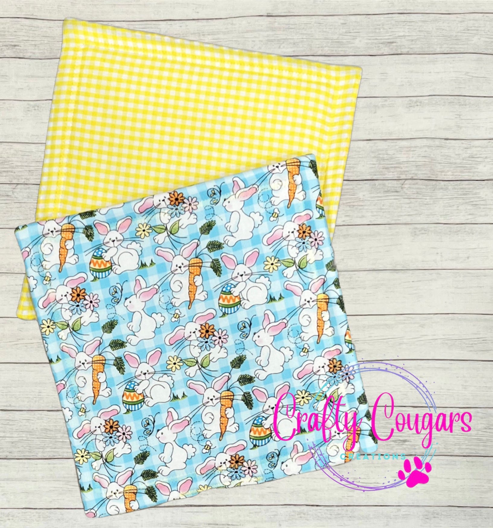 This standard-sized pot holder features Easter bunnies with carrots, eggs, flowers and butterflies on one side and a coordinating fabric on the other side. You will find these very useful for protecting your countertops from heat. They are made with coordinating cotton fabrics on the front and back and 2 layers of insulated batting on the inside for heat resistance. These are sold as individual pot holders, not as a set. Each pot holder measures approximately 9 inches by 9 inches.