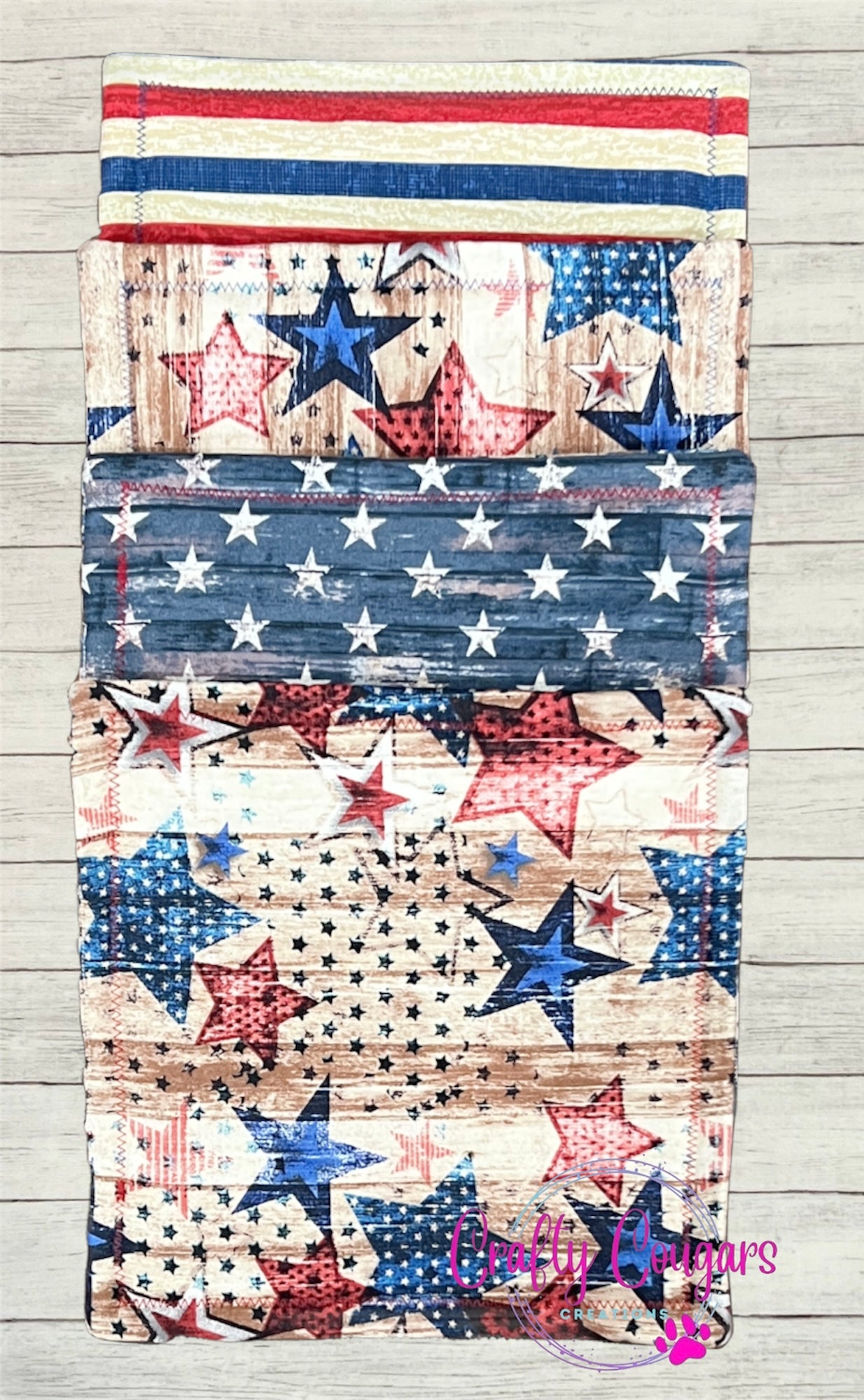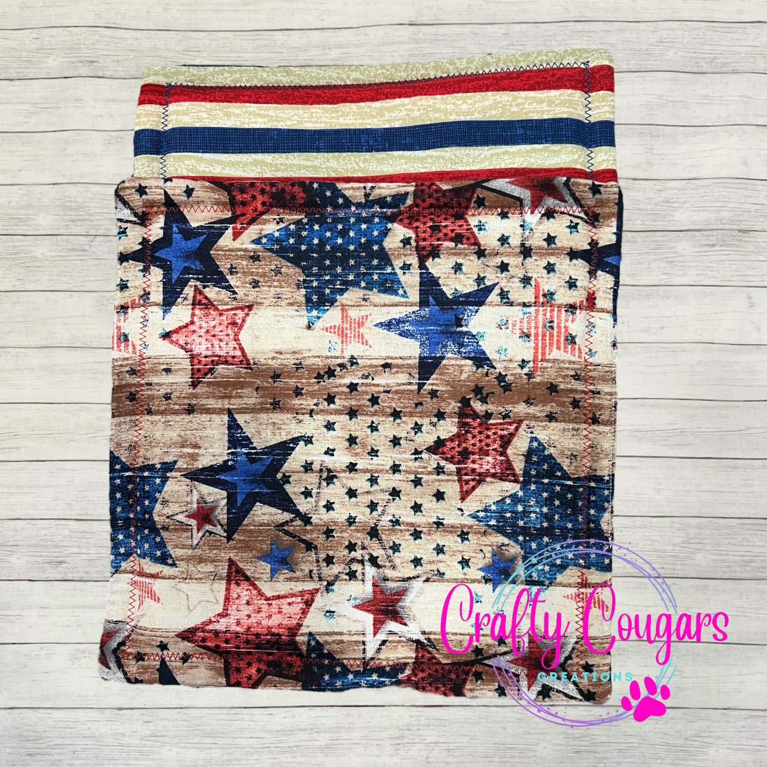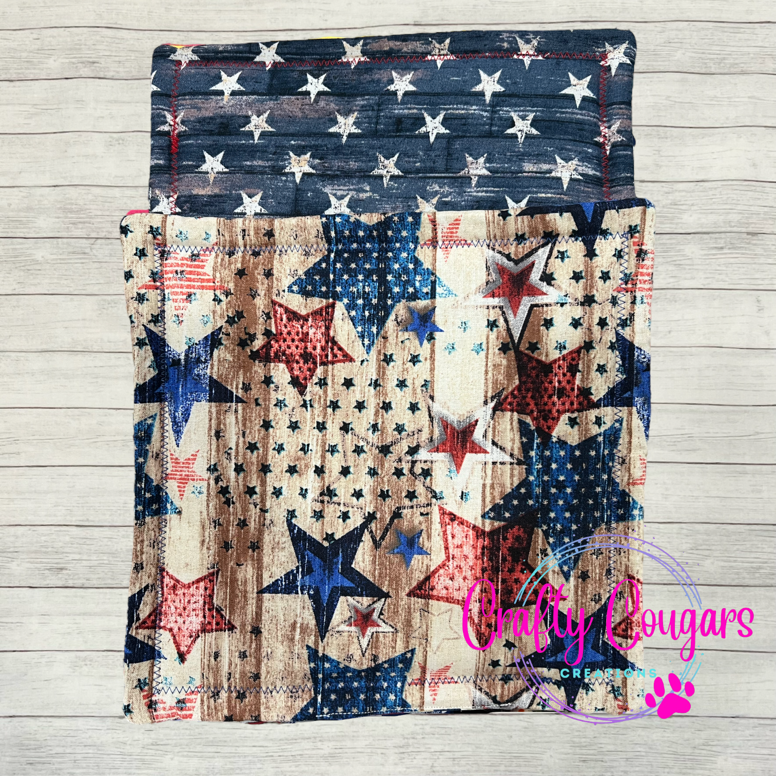 This pot holder is perfect for all of your patriotic holiday parties! With its vintage design, it features stars on one side and a coordinating stars or stripes fabric on the back. You will find these very useful for protecting your countertops from heat. They are made with coordinating cotton fabrics on the front and back and 2 layers of insulated batting on the inside for heat resistance. These are sold as individual pot holders, not as a set. Each pot holder measures approximately 9 inches by 9 inches.