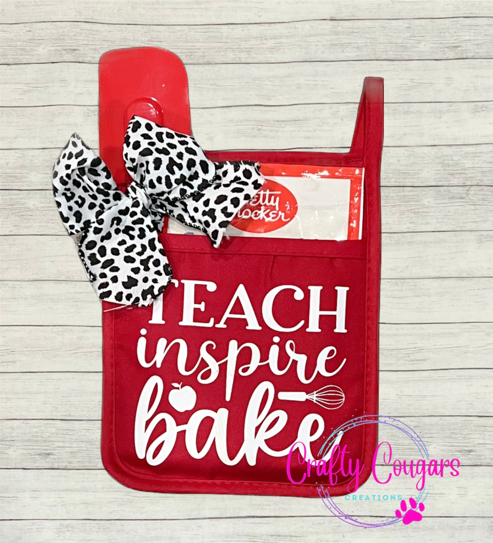 Show your teacher appreciation with this adorable bake set! The pot holder is red and in white vinyl it reads, “Teach Inspire Bake”. This set comes filled with Sugar Cookie mix, a silicone spatula and wrapped with a decorative bow. The pot holder is full functional with a rubber backing to protect your hand or countertop from hot objects. These measure approximately 7 inches by 9 inches.