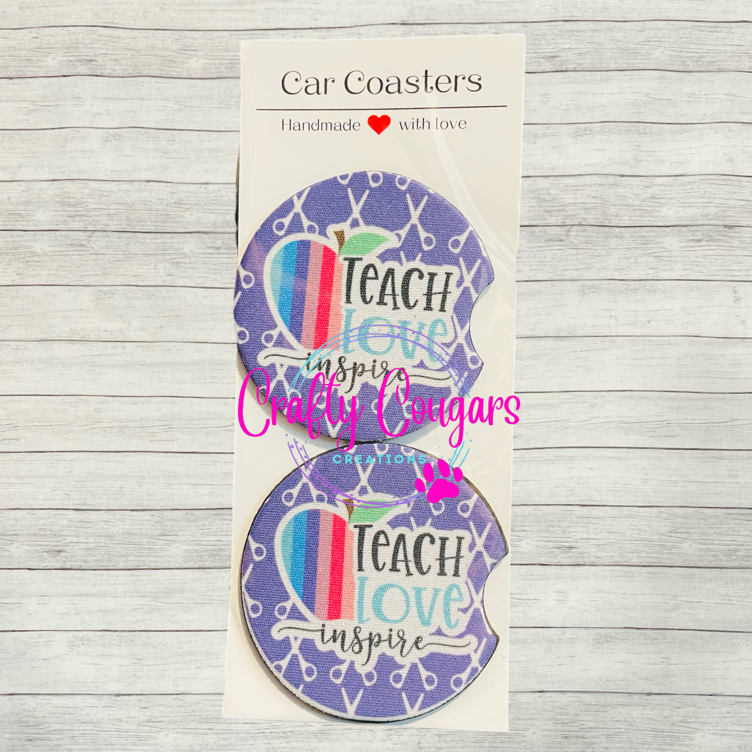 This adorable set of car coasters feature “Teach Love Inspire” against a purple background with scissors in the shape of a lattice design. These coasters are sure to keep your cup holders clean and stylish! They are made of a waterproof neoprene material that is great at soaking up drink sweat, dries quickly and can endure high heat. The image is printed with a special sublimation ink and the ink is heat pressed into the fibers of the coaster, ensuring they will not fade. These measure approximately 2.75 inches in diameter and are designed to fit in most vehicles’ cup holders.