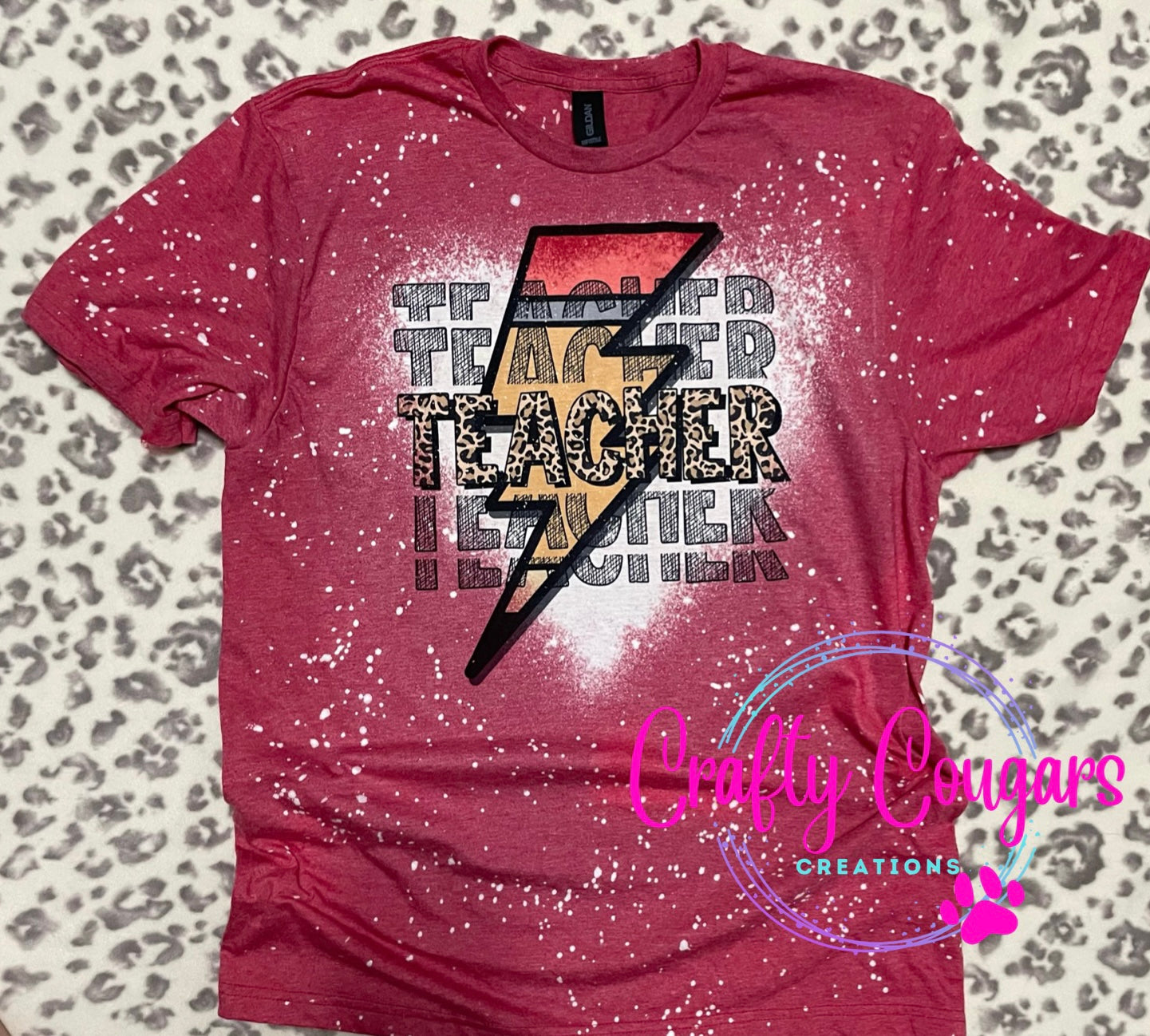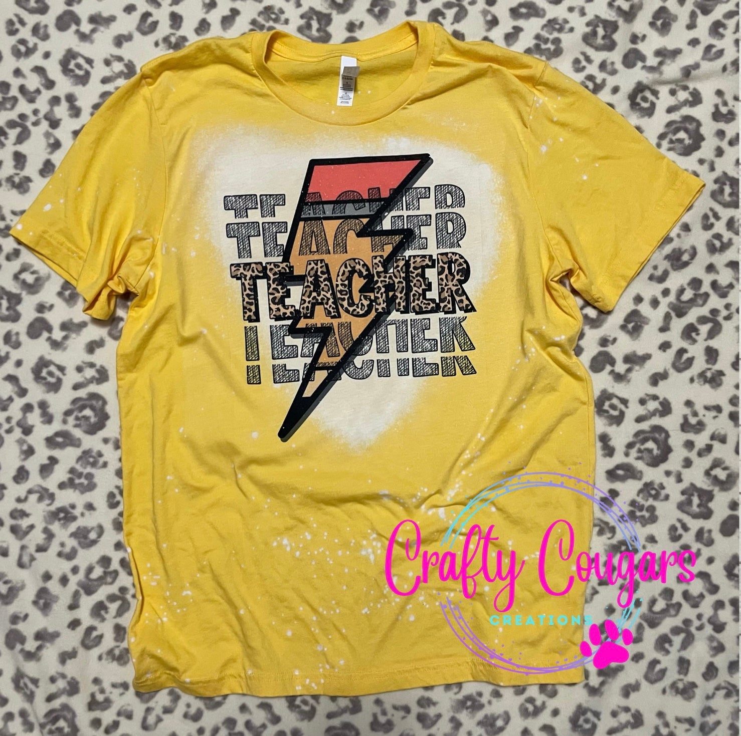 "Teacher” is a sublimation image that is pressed on a hand-bleached shirt. Our shirts are unisex, very soft polyester/cotton blend and run true-to-size. Each shirt has been pre-washed and pre-shrunk.