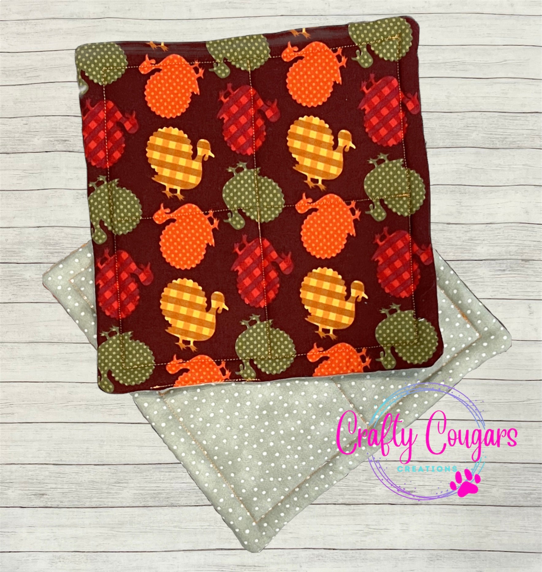 This cute thanksgiving pot holder features multi-colored turkeys with a coordinating olive green and white polka dots print on the back. You will find these very useful for protecting your countertops from heat. They are made with coordinating cotton fabrics on the front and back and 2 layers of insulated batting on the inside for heat resistance. These are sold as individual pot holders, not as a set. Each pot holder measures approximately 9 inches by 9 inches.