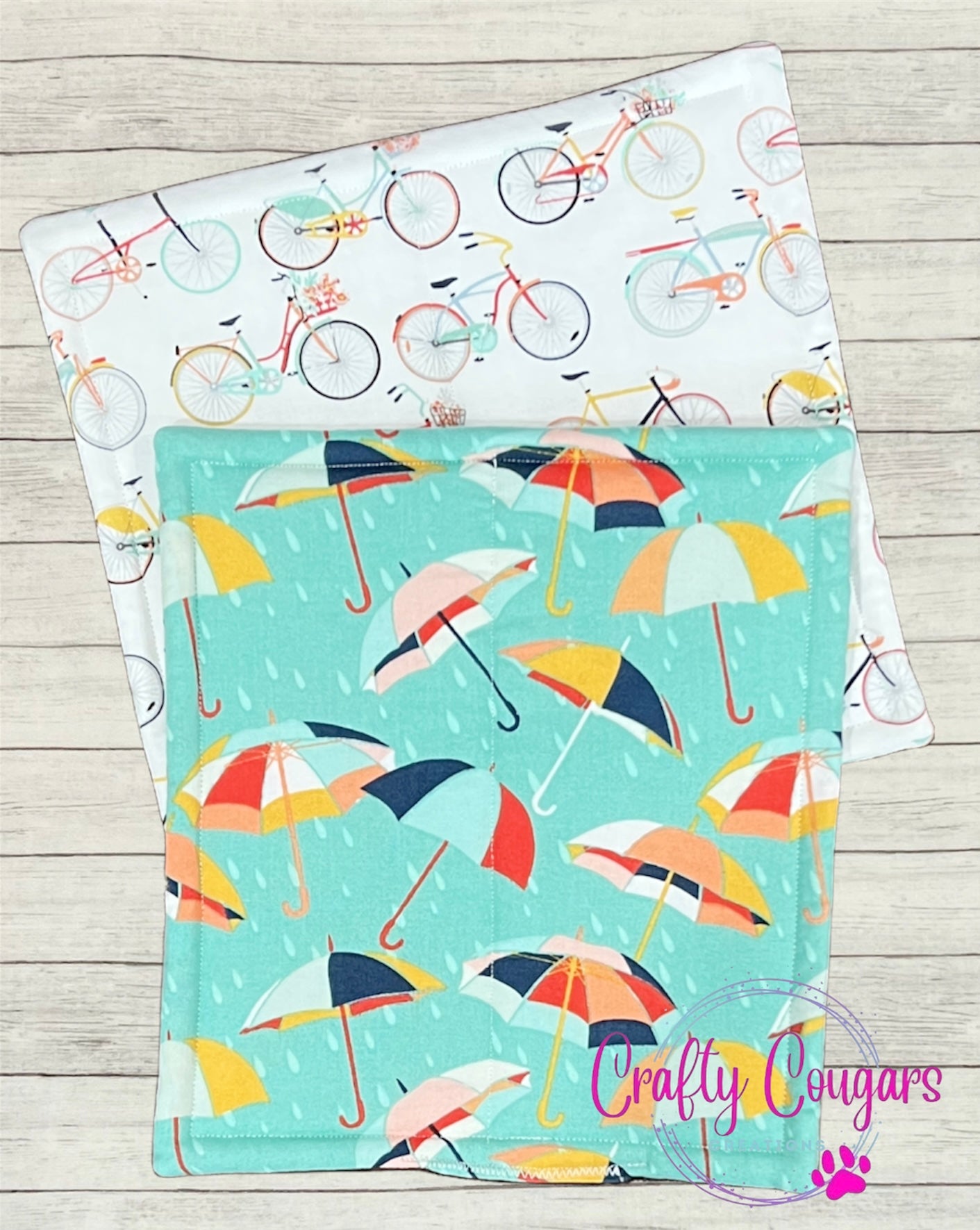 April showers bring May flowers! This pot holder features cute umbrellas and raindrops on one side with colorful bikes on the back. You will find these very useful for protecting your countertops from heat. They are made with coordinating cotton fabrics on the front and back and 2 layers of insulated batting on the inside for heat resistance. These are sold as individual pot holders, not as a set. Each pot holder measures approximately 9 inches by 9 inches.